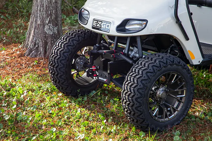 Adding an aftermarket lift kit to your golf cart gives it some needed ground clearance and ride stability. If you’ve been craving bigger tires but need the space to fit them under your fenders—you’ve found your fix. Additionally, putting in an E-Z-GO lift kit results in a widened footprint which improves stability. Those additional inches, along with all-terrain tires, allow you to handle territory previously unexplored.