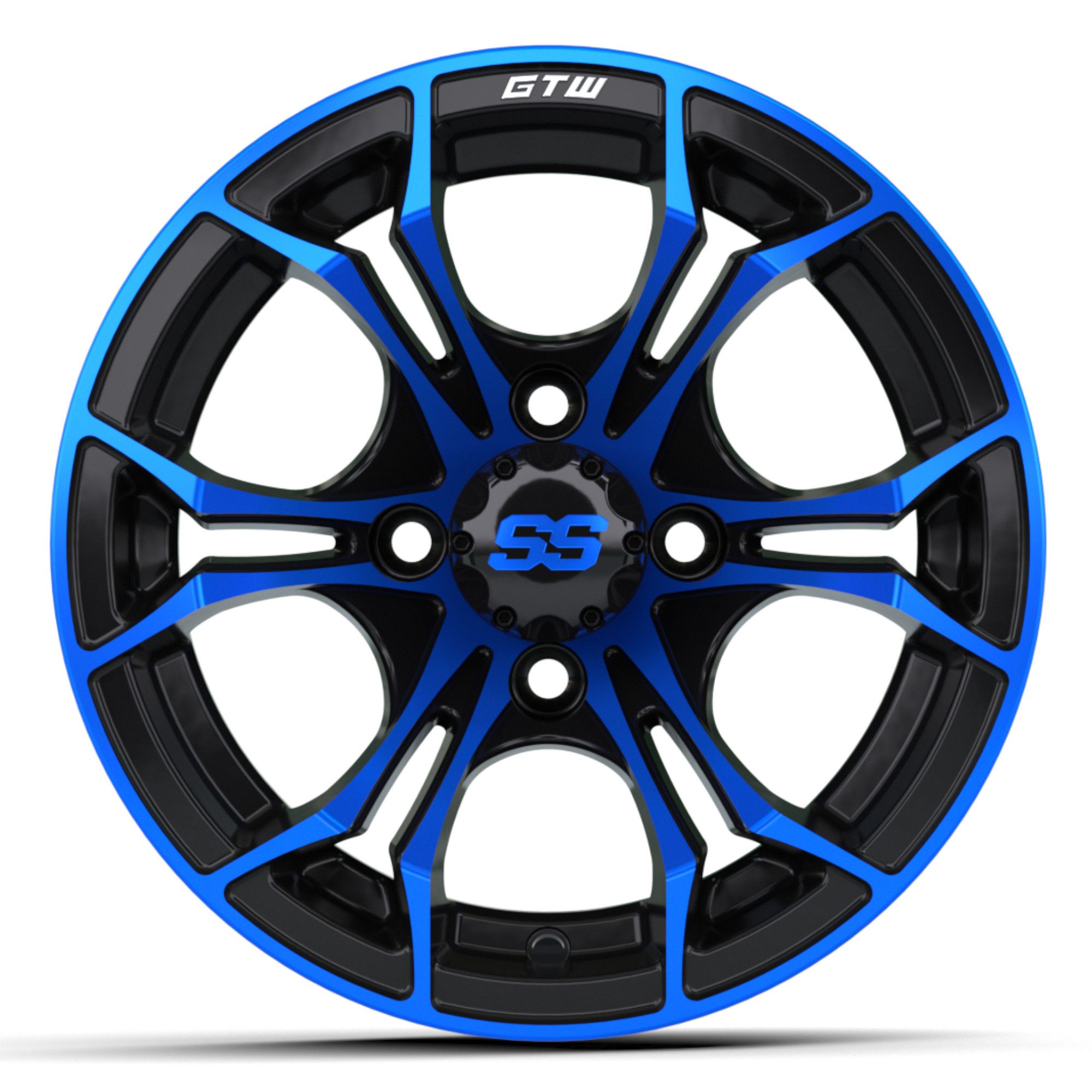 The GTW Spyder Black with Blue Accent Wheel at Buggies Unlimited is a rim that even an arachnophobe could love. There is nothing like a new wheel to make the neighbors envious. We understand what competition the locals can put together without even realizing it. Someone makes an upgrade, and someone else gets jealous and takes it a step further. Before you know it, you will have a fleet of upgraded carriages roaming the streets looking for new ideas. It's all about staying ahead of the Joneses. Stay ahead of everyone by calling us.Get a set of these installed, and you will immediately notice a speed increase. This is because you have changed the gear ratio. Now we know what you are thinking. I didn't even crack the pumpkin. Those are not the only gears you need to worry about. Think about the earth like a big gear and your golf cart tire as the tiny one that rides on it. Just like if you change gears in the diff, you will get a change in performance. If you increase the size of your rims, you will gain speed and lose torque.Getting the Spyder black with blue accent wheel from Buggies Unlimited installed is better done by us. If you order a set of tires at the same time, we will do it for free. However, if you have a set of rubber you want to re-use, you need to take them to a local shop with the proper equipment.Ordering parts from Buggies Unlimited is a great way to save a bunch of money and get a quality product in the process. We make it easy to get everything you need in a hurry. So call us today to get a great deal on this GTW wheel and whatever else you need.
