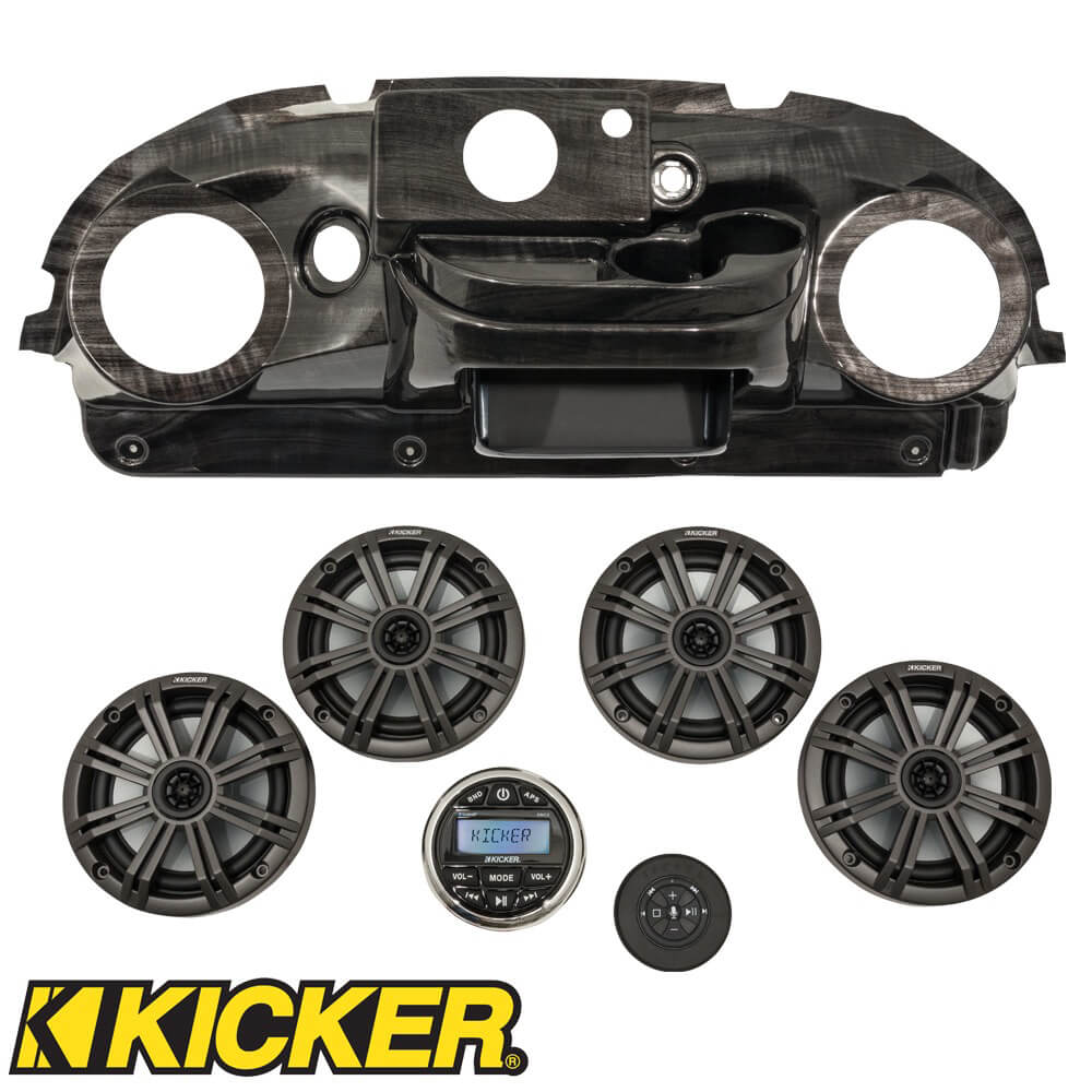 The Club Car Kicker Dash and Audio Kit fits Precedent models 2004 and newer, gas or electric. The dash is pre-cut to mount the receiver and two of the 6.5-inch speakers. The other two speakers get mounted at your discretion. Anywhere but the new golf car dash. It will include hardware and instructions with a total installation time under 10 minutes using standard household tools. There's no need to run down to the hardware store for a flux capacitor on this one. We will save that for controllers.The kit also comes with a custom dash in a glossy greywood finish and a Kicker KMC2 200W weatherproof gauge style media center with bluetooth control. You can also utilize many standard functions like USB for charging and playback, RCA, and AM/FM. There are four total marine-grade speakers with this kit. That is double what typically comes with this style golf cart audio system. Buggies Unlimited wants you to have the best sound quality possible at the best price on the market.