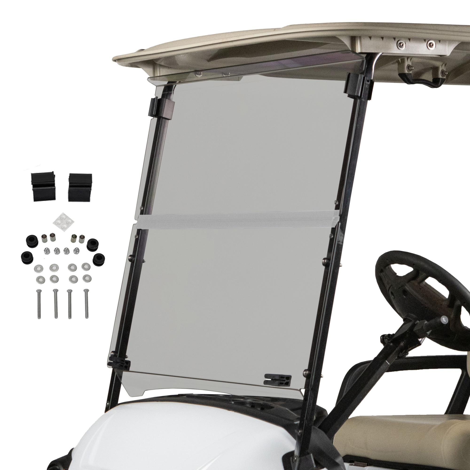 Getting lost in the woods is never fun. However, not having a Yamaha Drive2 Tinted Folding Windshield to brave the beach can leave you feeling just as bewildered. The sun is blinding, and when you reflect it off of a white sandy coastline, it can be like headlights on a mirror. Having anything to reduce the glare on your eyes can make things a lot more enjoyable. We are not saying ditch the sunglasses; we are saying that you might want to take them off from time to time and not get flash banged when you do.Your eyes are susceptible to bright light and solar radiation. Leaving them unprotected can cause vision loss. We more than likely should not have had those sun staring competitions that we held on the playgrounds of every school growing up. If only we had listened to our parents, we might have been able to avoid these soda bottles we have to wear on our faces. Take it from your friendly golf cart expert; it is tough to find your ball around sunspots on your field of vision. This smoked acrylic could help preserve the younger generation's sight at a better clip than our own.This golf cart windshield is a very easy product to install. Everything you will need to put this product on the existing supports will be in the box. You may not see it at first glance, but you will find it if you open the other end of the box. We place it below a false bottom to protect it in shipping. There is also film on all four surfaces of the acrylic. You will need to peel this off to get maximum clarity. Just make sure you dry fit it before doing this; once you remove it, you cannot return it. Call Buggies Unlimited and order the Yamaha windshield today.