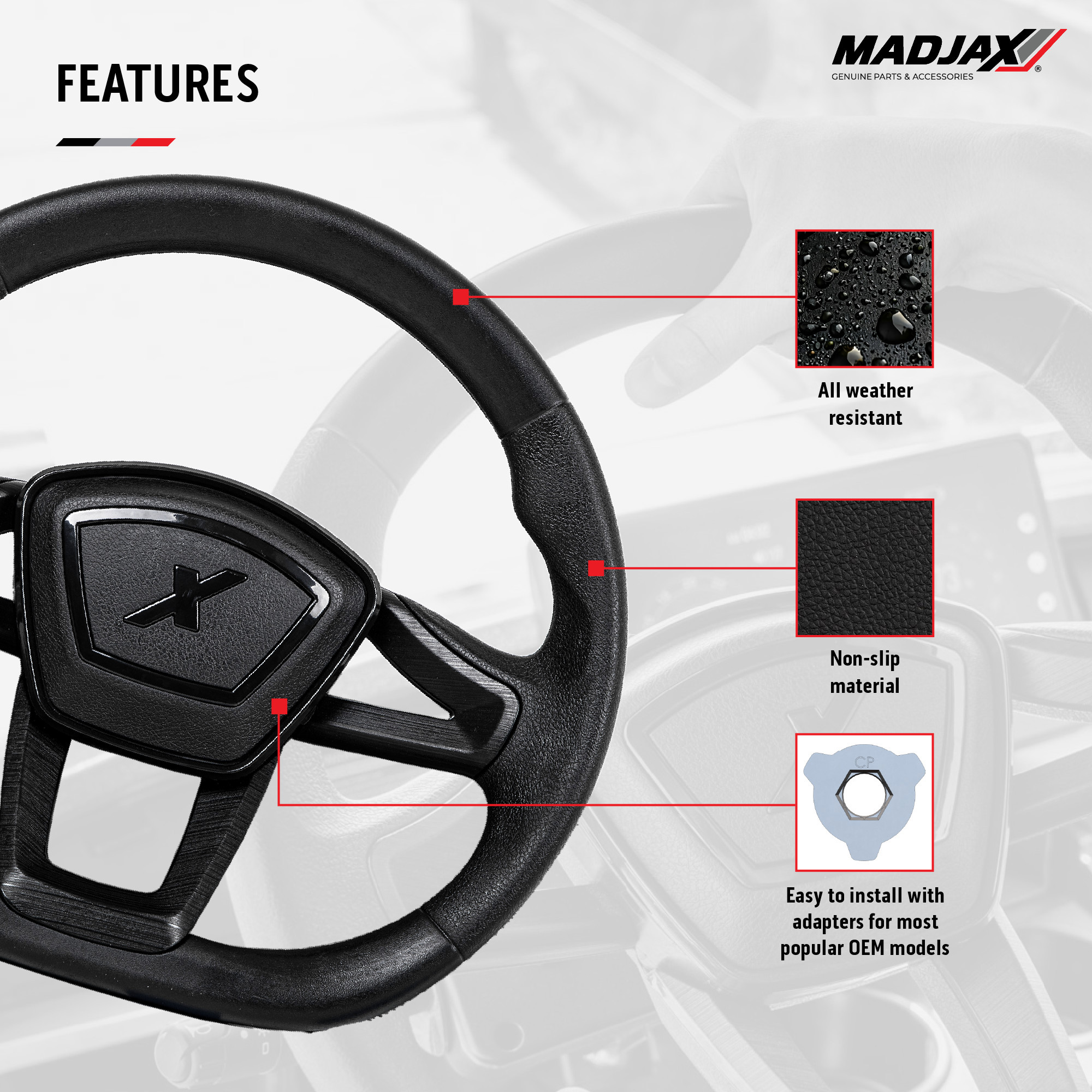 The MadJax® Cruise Steering Wheel comes with everything you need to improve your driving experience in one convenient package! This high-quality bundle includes an ergonomic steering wheel designed for comfort and precise control, along with a compatible adapter for easy installation on most golf cart models. Enjoy better handling and a sporty new look for your cart!