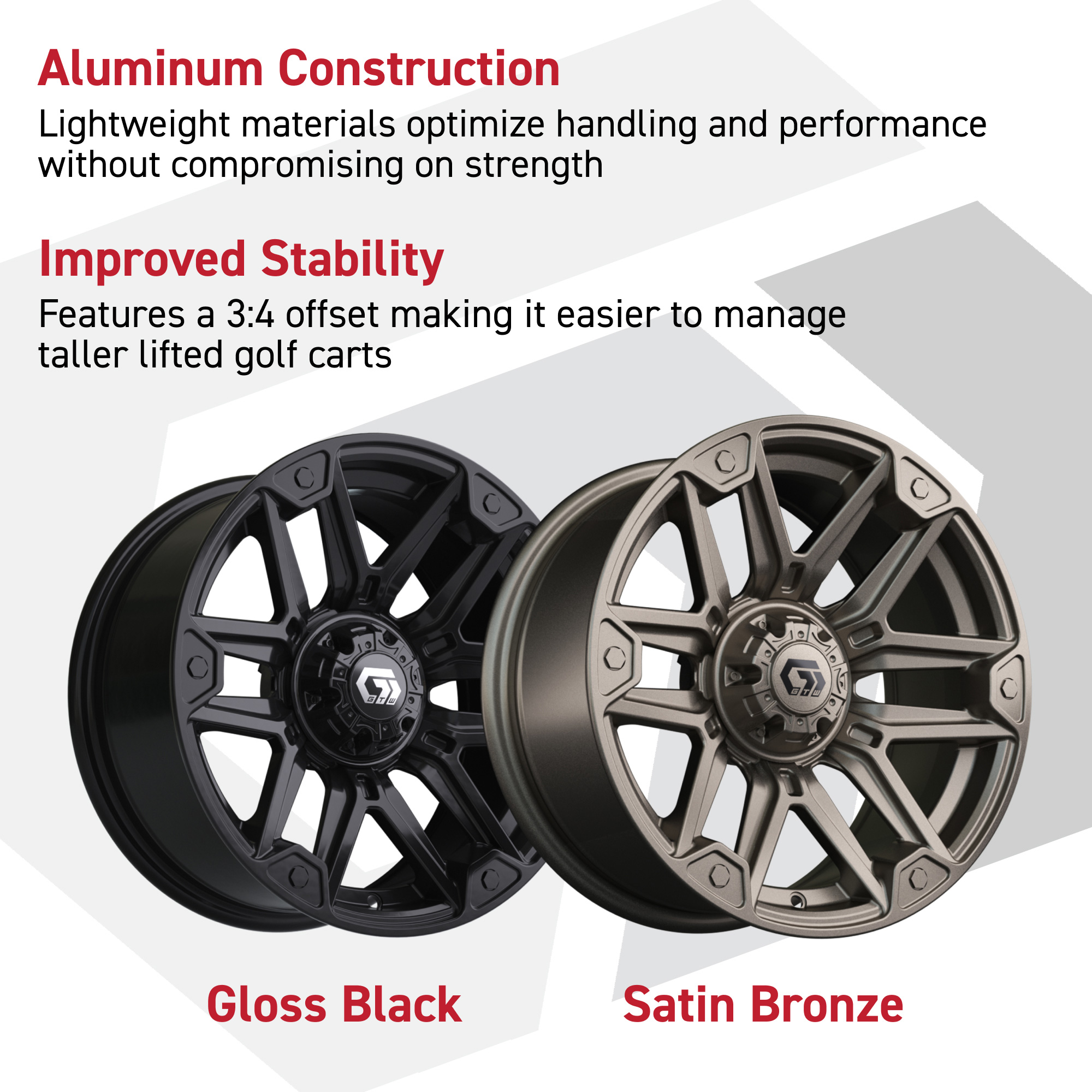 The GTW Graffiti Wheels are made with quality materials that give your golf cart an elevated look. With a bronze finish, these wheels offer a unique design that is sure to stand out on the golf course. Order today and get stylish wheels that don’t compromise on durability.