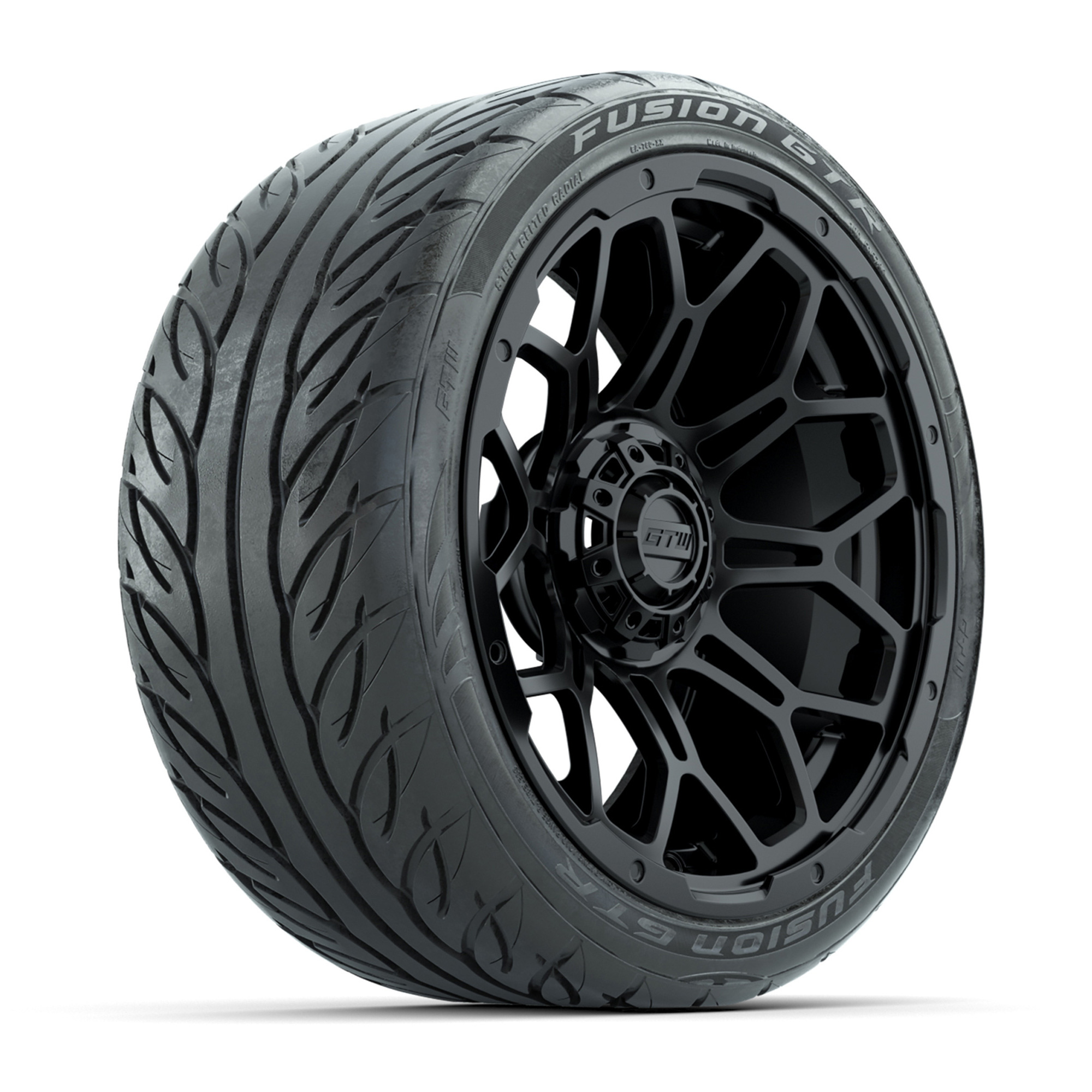 A set of (4) 15-inch GTW® Bravo Matte Black golf cart wheels mounted on 215/40-R15 Fusion GTR Steel Belt Radial Street Tires