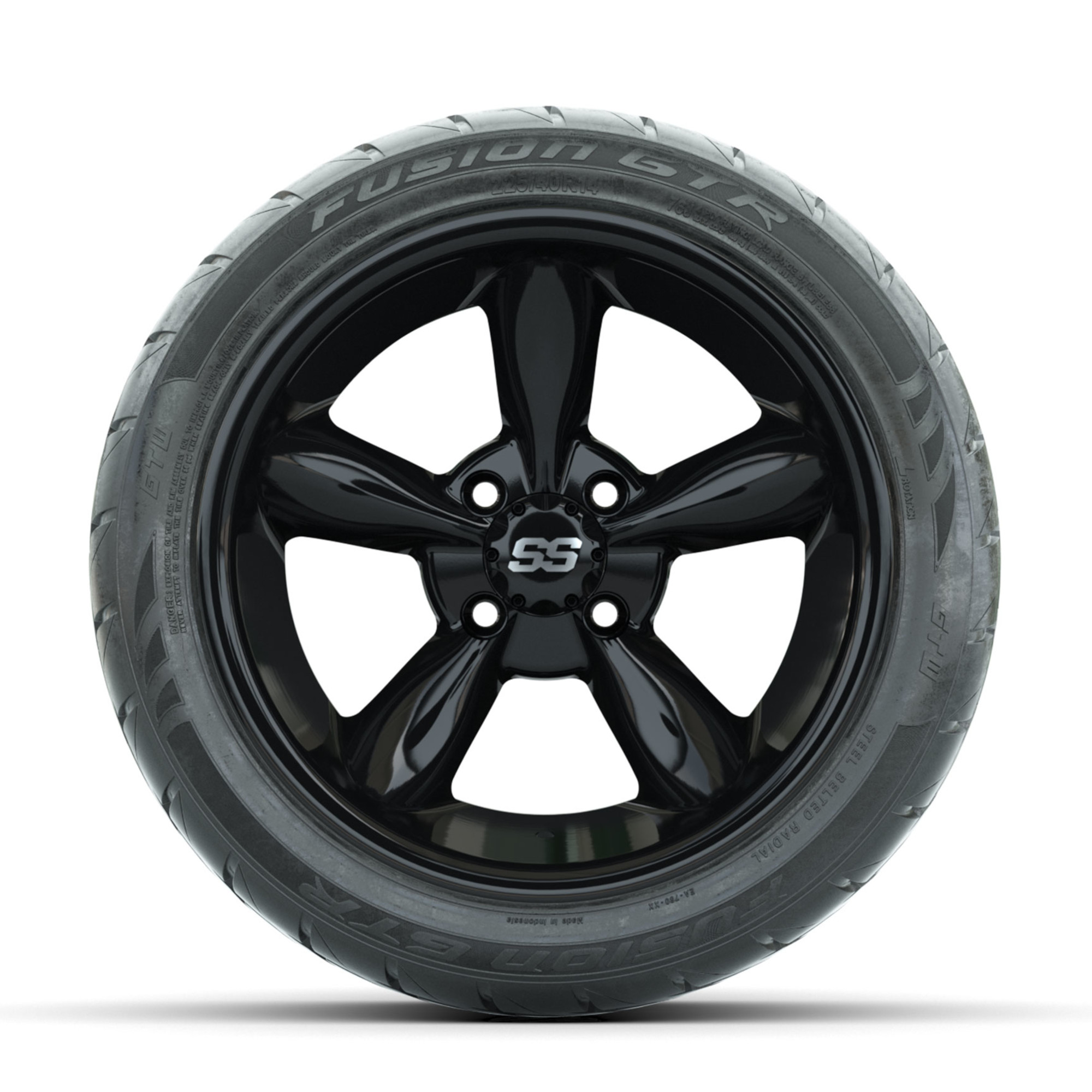 A set of (4) 14-inch GTW® Godfather Black golf cart wheels Mounted on 225/40-R14 GTW® Fusion GTR Steel Belted Street Tires