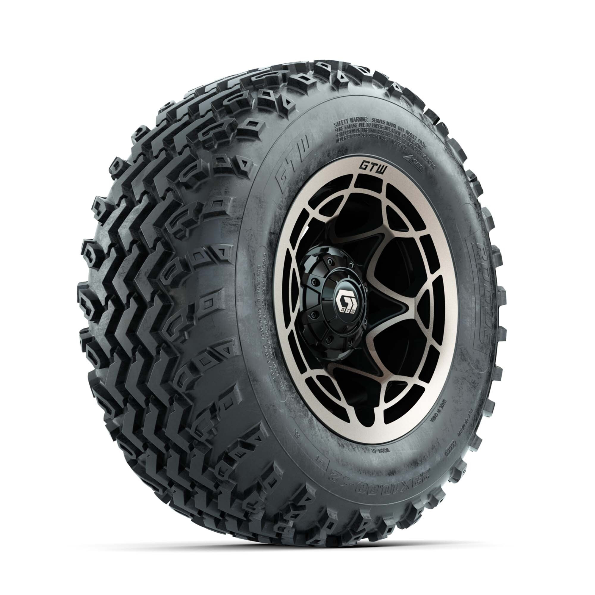 A set of (4) 12-inch GTW® Nexus Black/Bronze golf cart wheels mounted on 23x10-12 GTW® Rogue all-terrain tires
