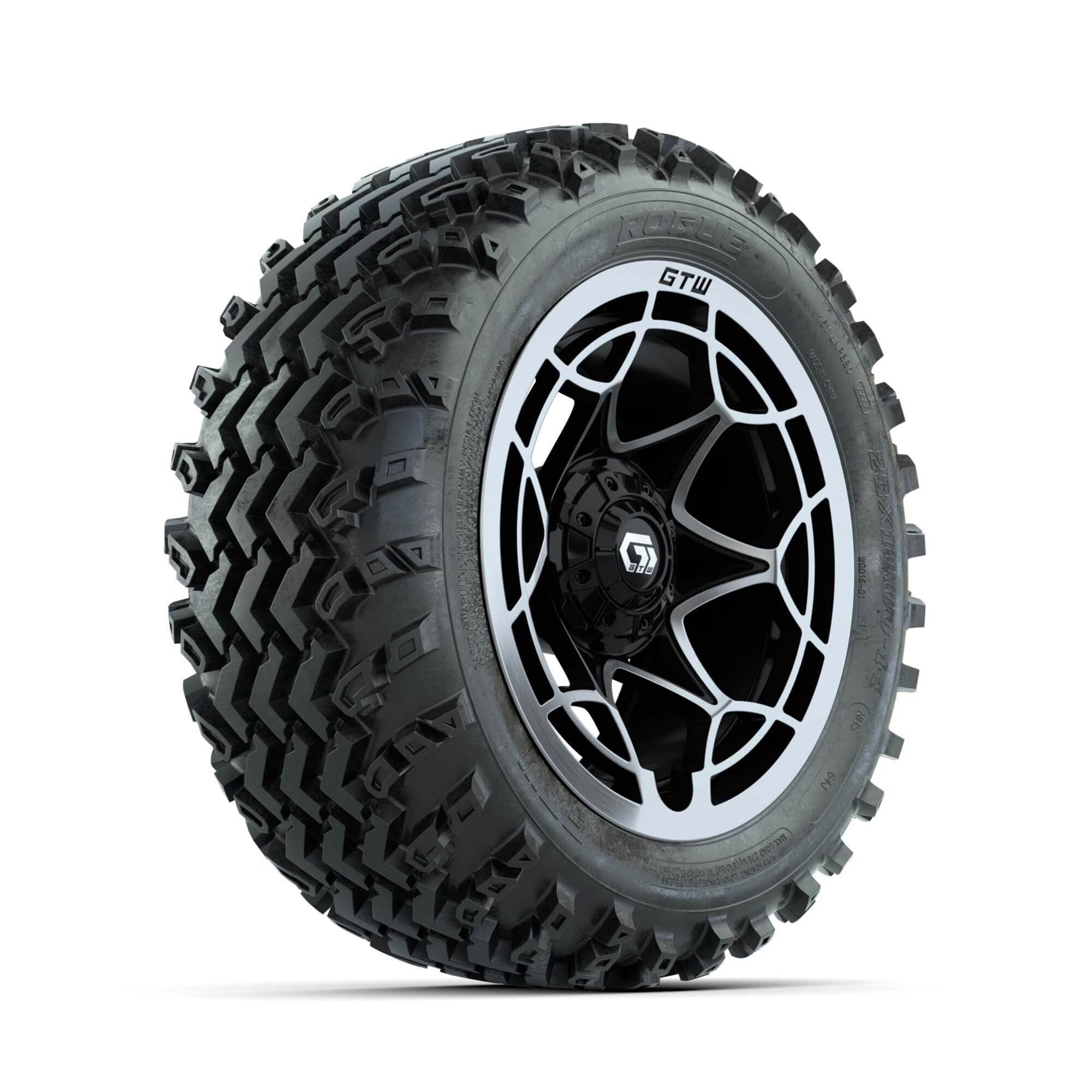 A set of (4) 14-inch GTW® Nexus Black/Silver golf cart wheels mounted on 23x10-14 GTW® Rogue all-terrain tires