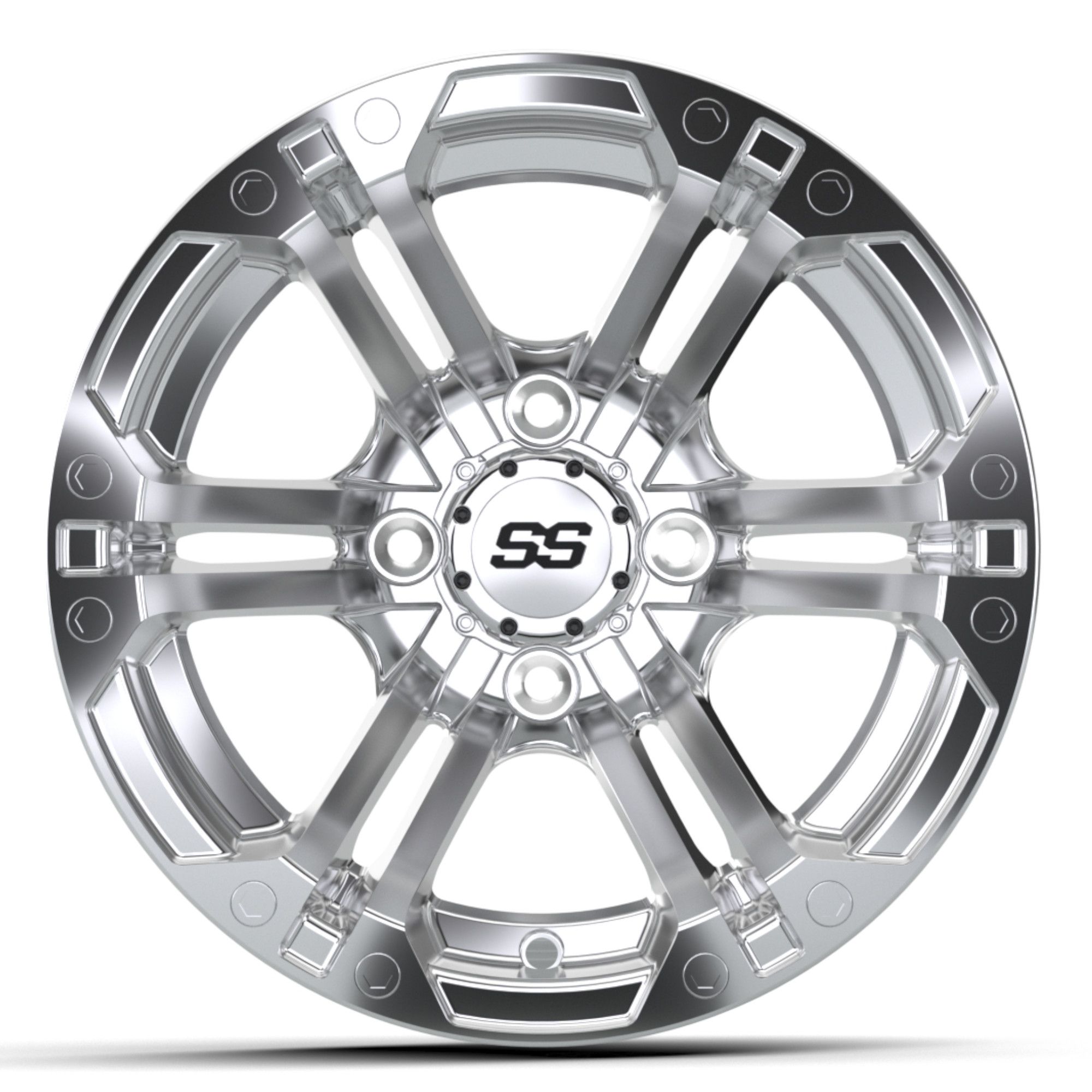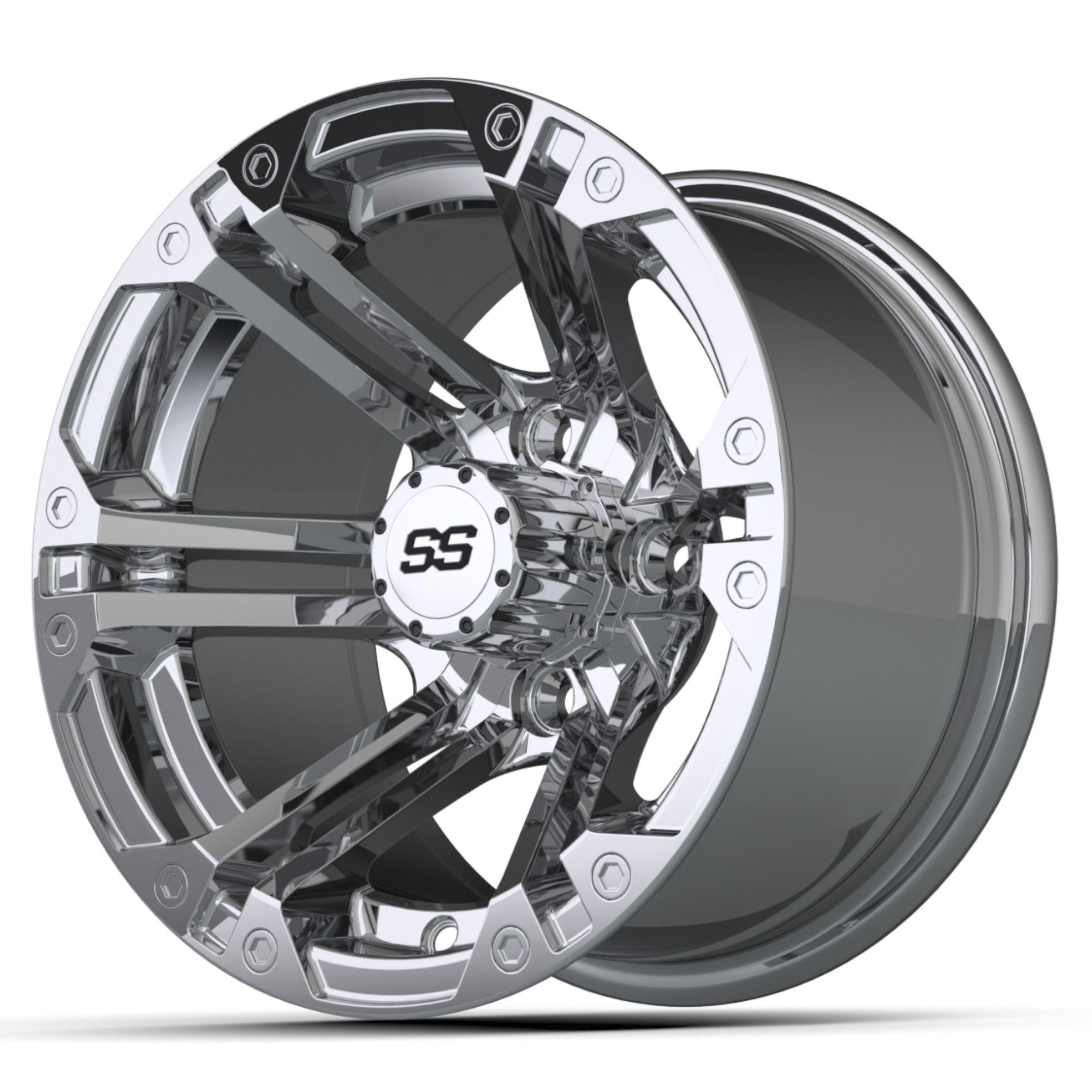 What says class more than the GTW Specter Chrome Wheel from Buggies Unlimited? We are not sure either. These aftermarket rims are a polished dream that will leave your neighbors wanting some of their own. Just ensure you tell them where you got the golf cart parts. Never fear; our selection is so vast, there is no chance they could duplicate your design. We like to provide enough options for everyone on the block to create something unique and all their own. Individuality is the spice of life!No matter what the application of your caddie is, these GTW wheels are ready for action. We have seen customers cruise the neighborhoods, take to the links and even bum it on the beach for the day. Even if you plan to hunt, it's hard to scare off the animals with reflection when covered in mud. There is not a place on earth these fancy rims will not fit right in. From the country club to the backwoods, you will feel right at home.All of the wheels we sell, the Specter included, is a four-on-four bolt pattern. This is what Club Car, EZGO, and Yamaha all use for their golf cart models. Several other manufacturers like Star Car and Harley use it as well. Some of the utility caddies use a five-lug for more durability. I that is the case, you are going to need an adaptor to make these fit. You can pick one up at your local ATV shop.These wheels are effortless to install, but it's best left for the professionals with the proper equipment. Don't it in your driveway is almost impossible. You can take it to a local tire shop for a nominal fee, or we will mount them for free if you order new tires simultaneously. Call Buggies Unlimited today and get a set ordered.