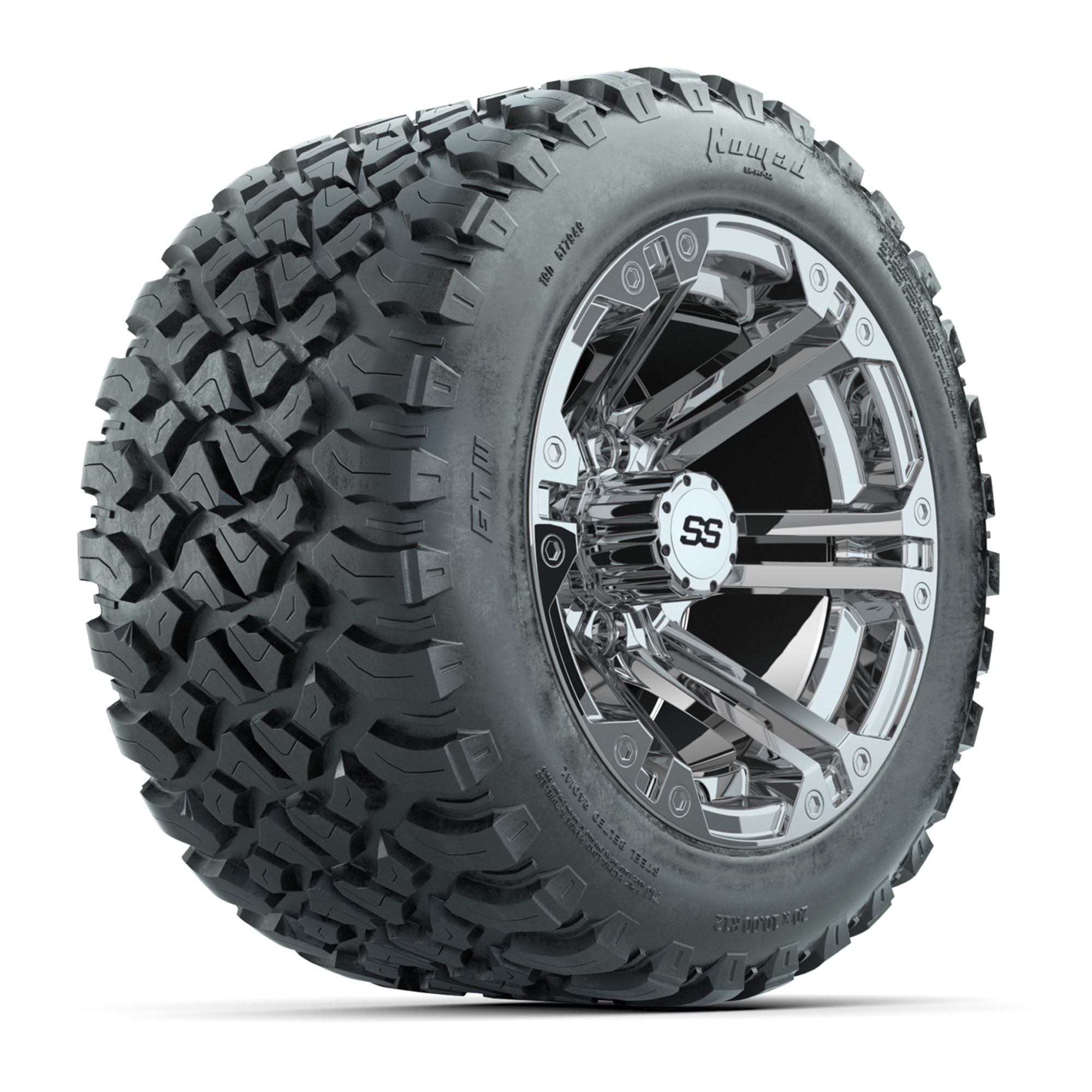 A set of (4) 12-inch GTW® Specter Chrome golf cart wheels mounted on 20X10-12 GTW® Nomad Steel Belt Radial All-Terrain Tires