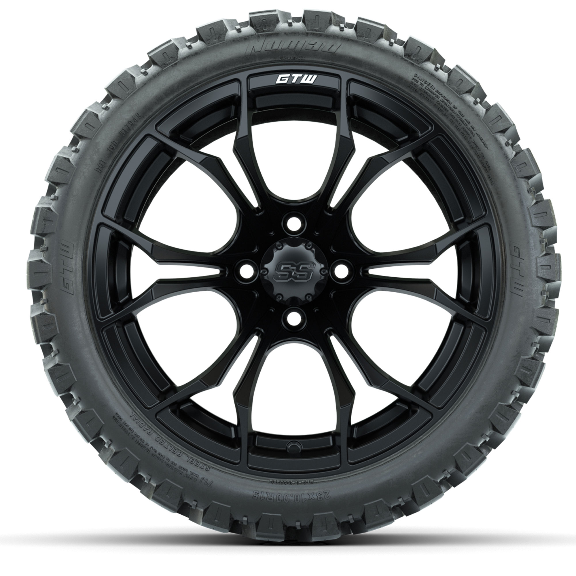 Set of (4) 15-inch GTW Spyder Matte Black Red golf cart wheels mounted on 23-inch GTW Nomad All-Terrain tires