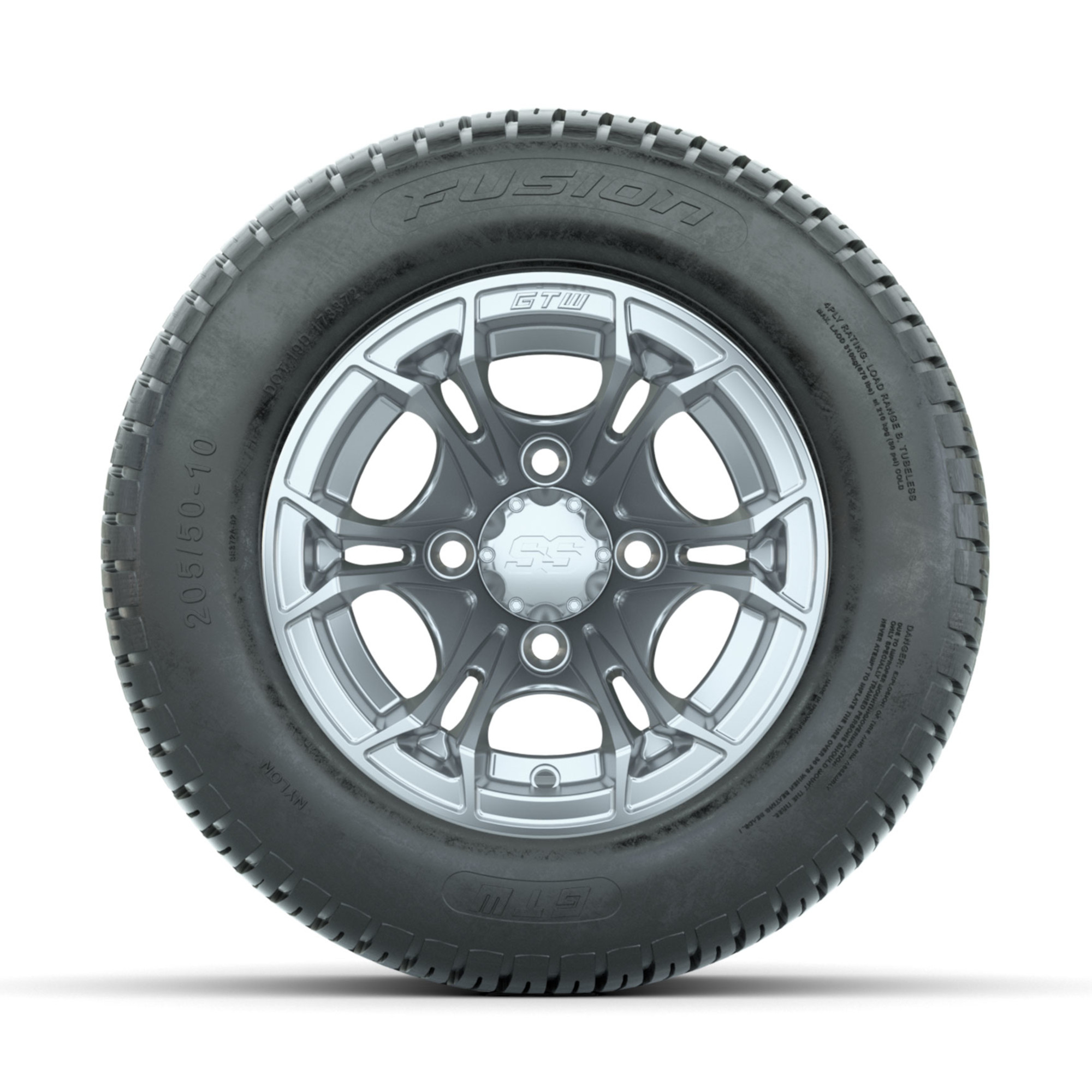 GTW® Spyder Silver Brush 10 in Wheels with 205/50-10 Fusion Street Tires – Set of 4