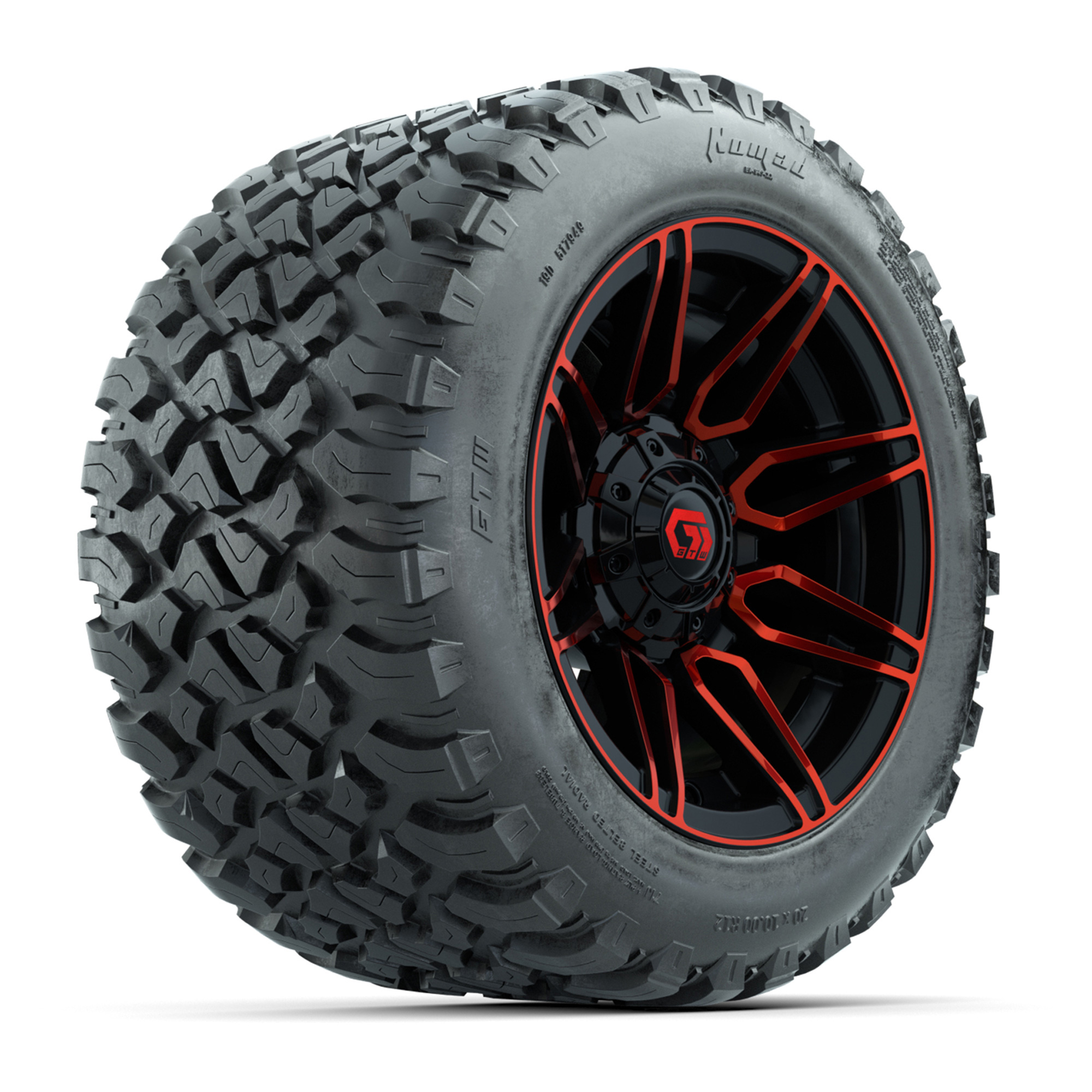 A set of (4) 12-inch GTW® Stealth Red/Machined golf cart wheels mounted on 20X10-12 GTW® Nomad Steel Belt Radial All-Terrain Tires
