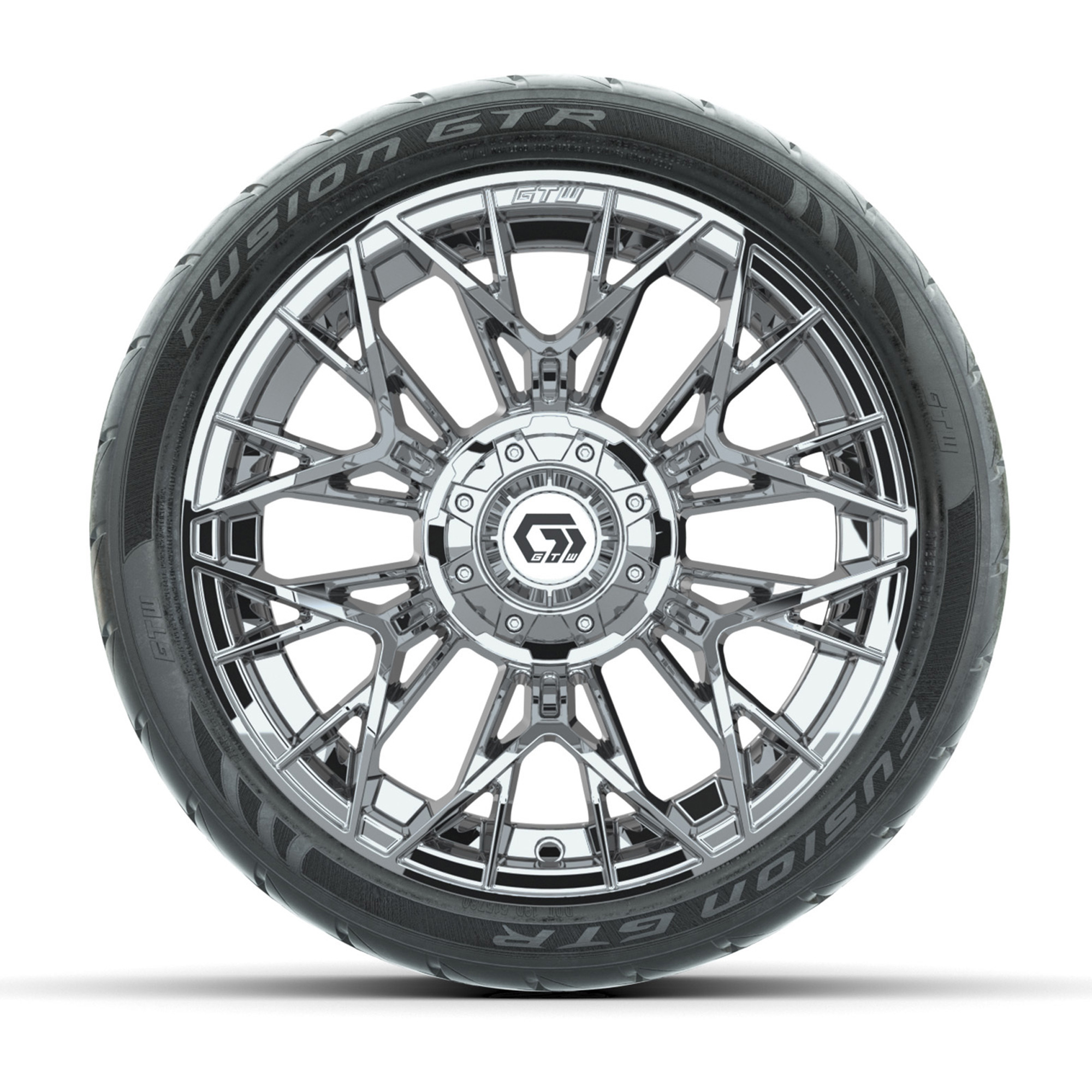 A set of (4) 14-inch GTW® Stellar Chrome golf cart wheels mounted on 205/40-R14 GTW® Fusion GTR Steel Belted Street Tires