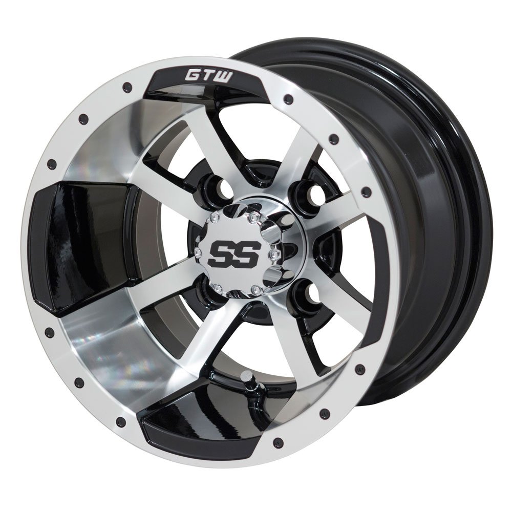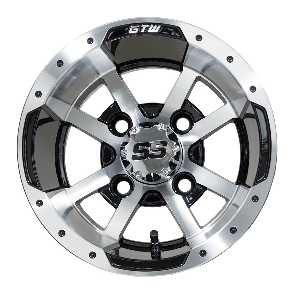 Find the droids you are looking for with the GTW Storm Trooper Machined Black Wheel at Buggies Unlimited. The Galactic Republic never looked better when members of the 501st rolled up in a buggy with a set of these bad boys installed. The separatists will be on the run big time with just one look. Their intimidation and fear will run rampant. Of course, with an aftermarket rim that nice, it would have to be packing some Jedi technology to wipe them off the face of the universe. Or they could be just plain old golf cart rims. Why not let them wonder?There are all kinds of heat when it comes to keeping up with the Jones's. These days it can almost be a full-time job. But, if you want to be on the cutting edge, a set of golf cart wheels can make the difference. Whether it's in the pick-up line at school, the Legion with the boys, or the parking lot outside your monthly PTA meeting. These golf cart rims fit right in just about anywhere except maybe Raxus. They would spot you from a mile away out there. In fact, anywhere else, you will be top of the block.We love to get things installed as quickly as possible. Getting a set of tires and wheels mounted to your golf cart is no problem at all. However, putting them on one another is a different story. We will do it for free if you order treads simultaneously and send them aired up in the box. No hassle is the way to go.Buggies Unlimited is the best place to turn when you need something for your golf cart. We have everything from accessories, to hard parts, to wheels and tires. So call us today and get what you need shipping right to your door.