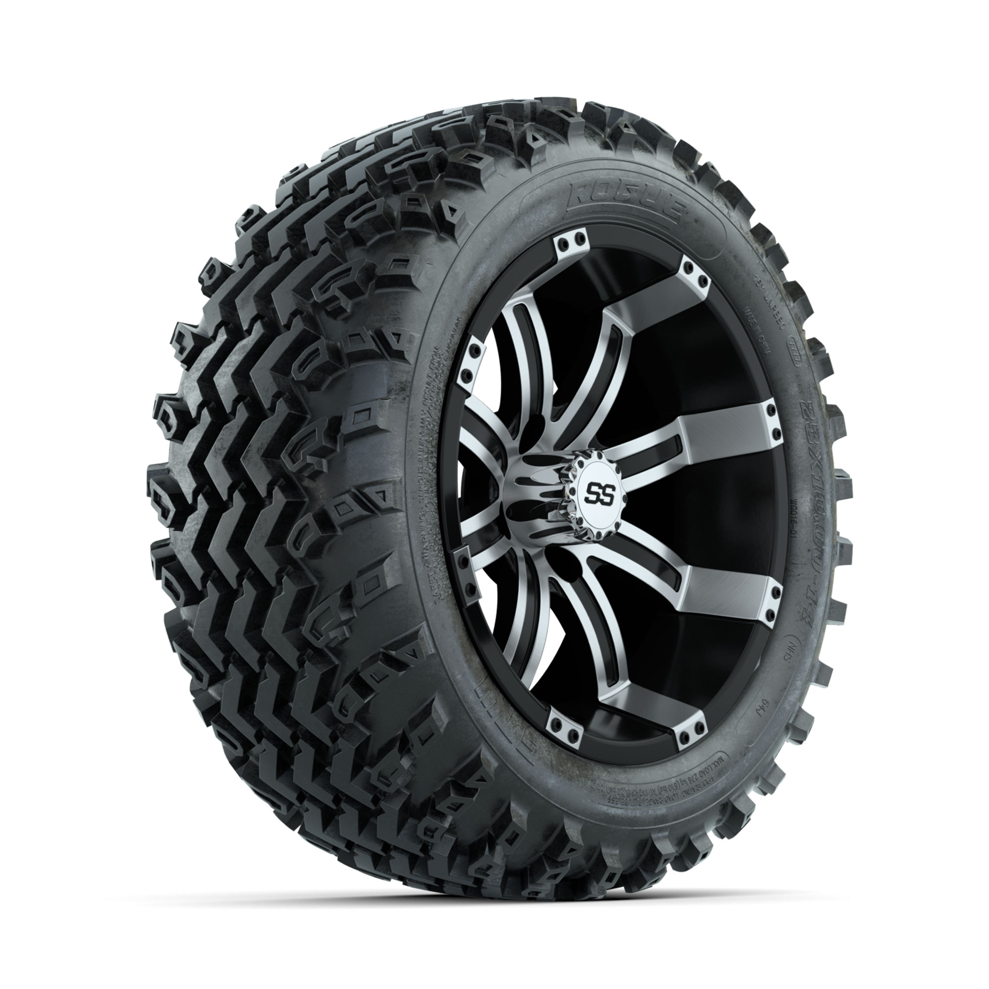 A set of (4) 14-inch GTW® Tempest Machined/Black golf cart wheels Mounted on 23x10.00-14 Rogue All-Terrain Tires