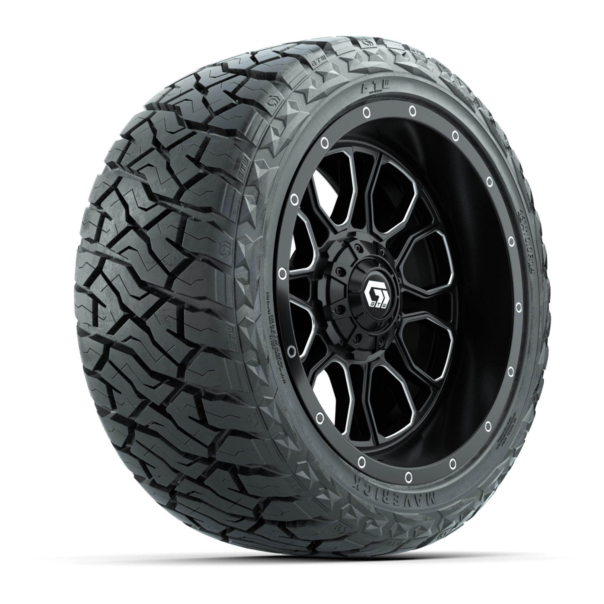 A set of (4) 14-inch GTW® Volt Black/Machined golf cart wheels Mounted on 23x10.00-R14 Maverick All-Terrain Tires