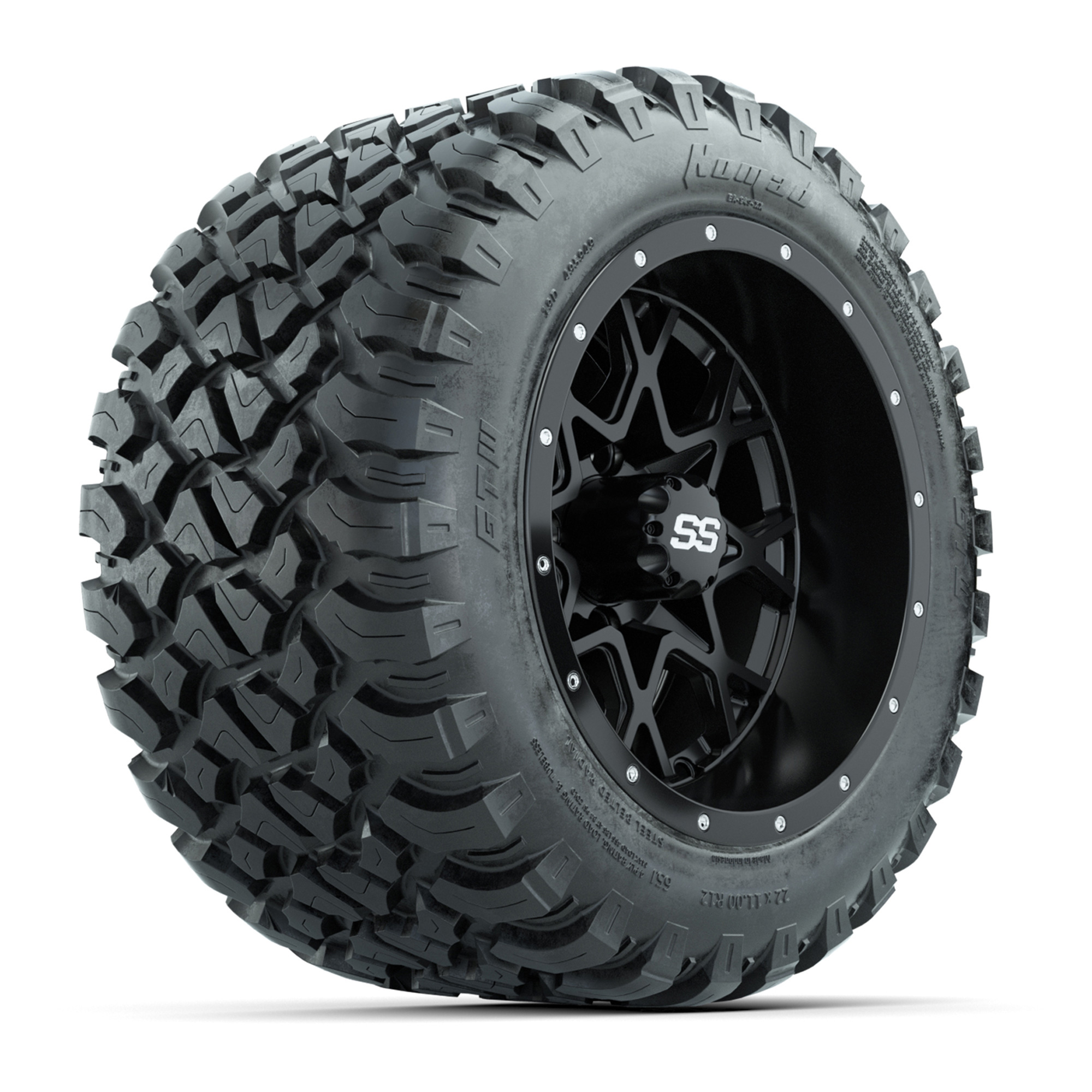 A set of (4) 12-inch GTW® Vortex 2 Matte Black golf cart wheels mounted on 22X11-R12 GTW® Nomad Steel Belt Radial All-Terrain Tires