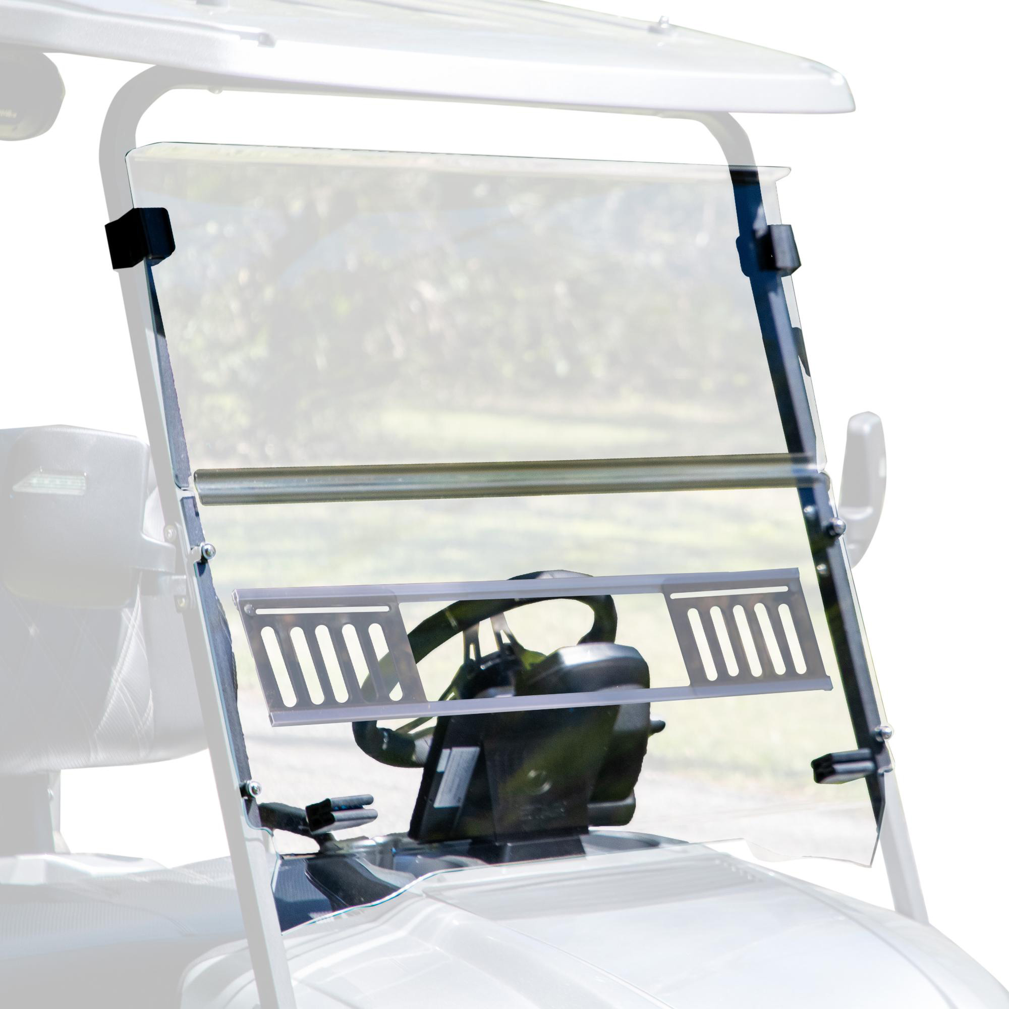 The vented folding windshield for the Star Sirius golf cart is designed to handle all weather conditions while offering adjustable airflow and coverage. Made from high-quality materials, it protects you from harsh elements and debris. Its UV-resistant surface prevents yellowing and shields against harmful rays so you can enjoy long-lasting quality for years to come!