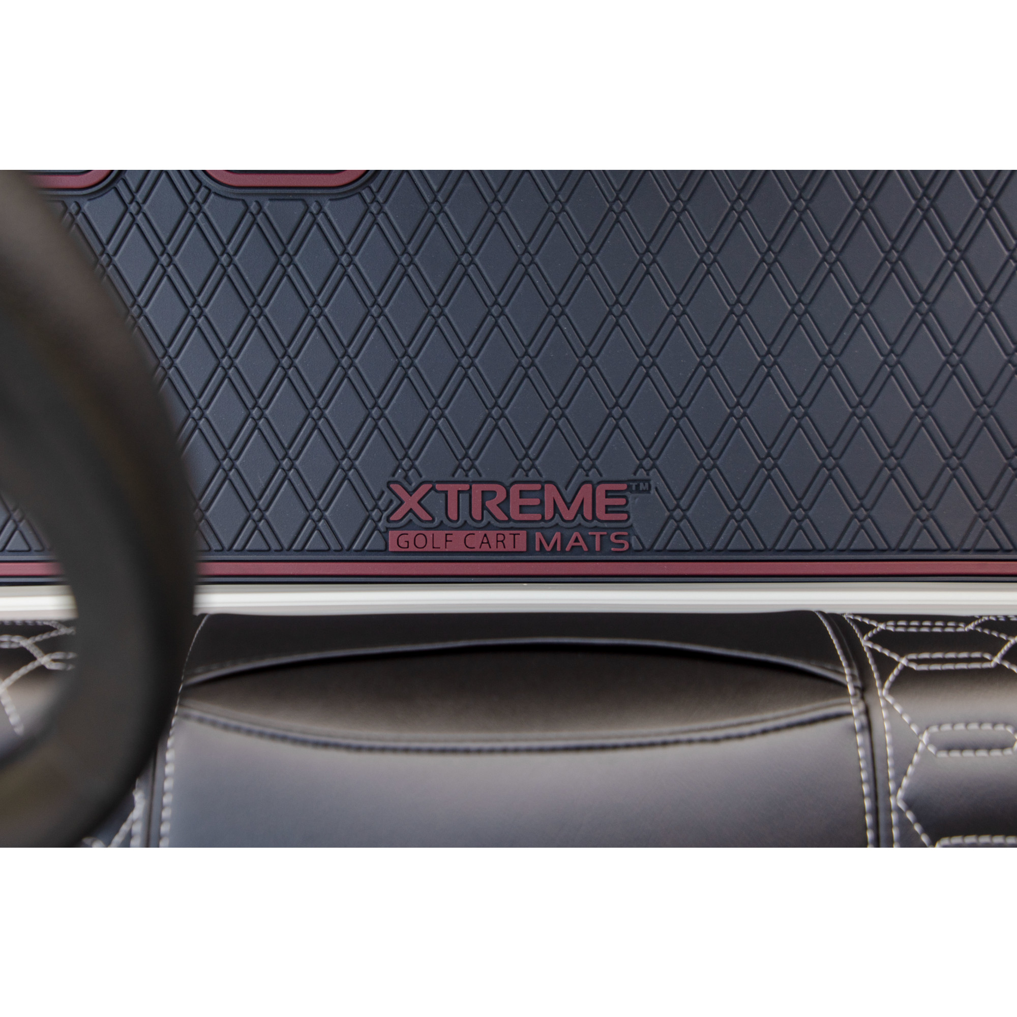 Full Coverage: Protects your entire cart floor, from the dash to the seat base, keeping it free from dirt, mud, water damage, and looking showroom-clean. Precision Fit: Engineered for a perfect fit around your pedals and seat base, this mat stays securely in place, enhancing safety and comfort. Durable Non-Slip Material: Engineered with durable 8mm thick material, this mat remains securely in place even on the bumpiest of paths, providing a safe and comfortable ride for everyone on board. Signature Diamond Pattern: The unique diamond pattern efficiently channels away dirt and water, keeping your cart's interior clean and dry. OEM-Grade Construction: Professional-grade material resists scratches, fading, and wear, mimicking OEM flooring for a premium look and feel. Reinforced Color Trim: Enhances durability for increased longevity and keeps your cart’s aesthetic appeal in check.