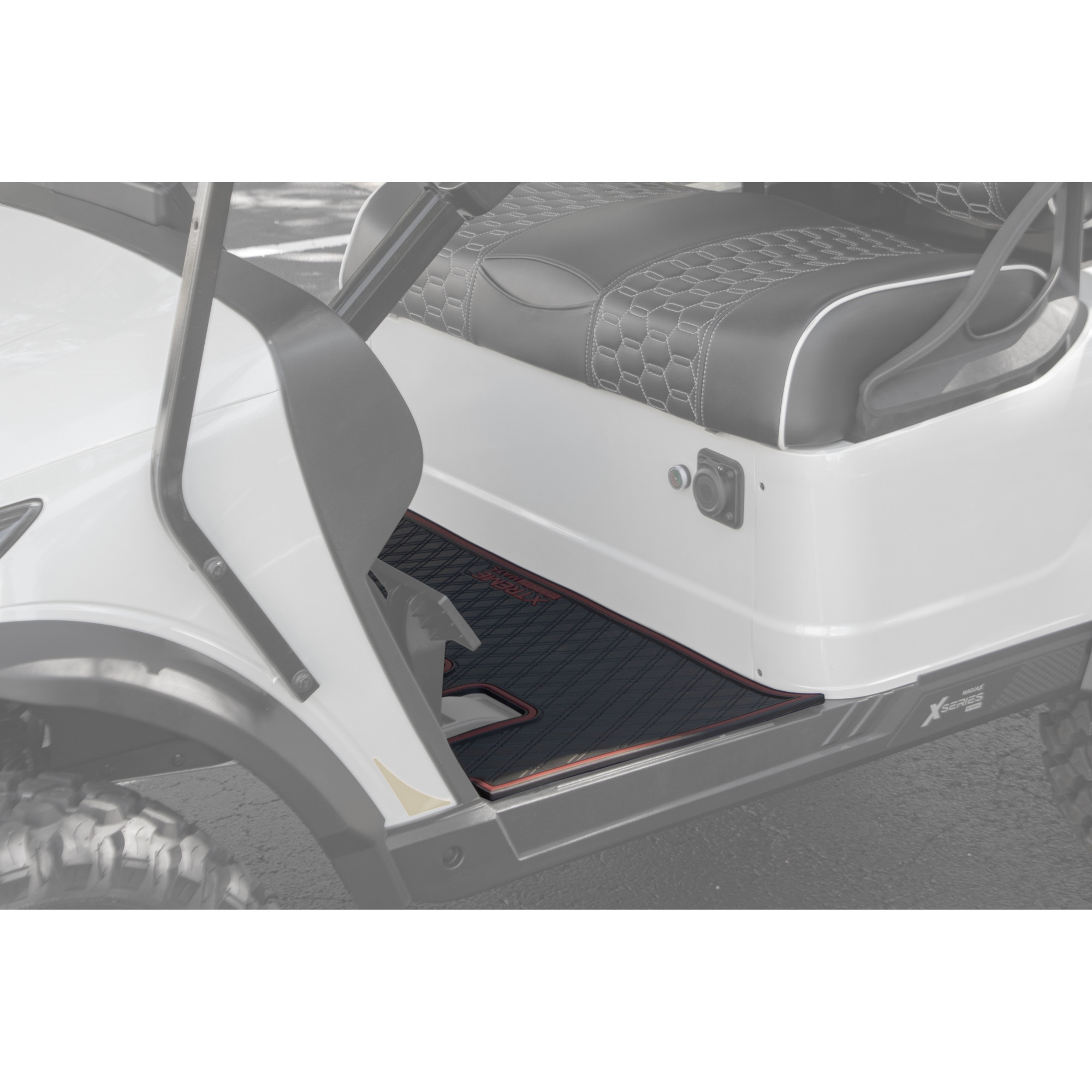 Enhance your MadJax X4 with the Xtreme Golf Cart Floor Mat, featuring a sleek black finish with eye-catching amethyst purple trim. Laser-measured for a flawless fit, this mat protects your cart's floors while adding a touch of unique, luxurious style.