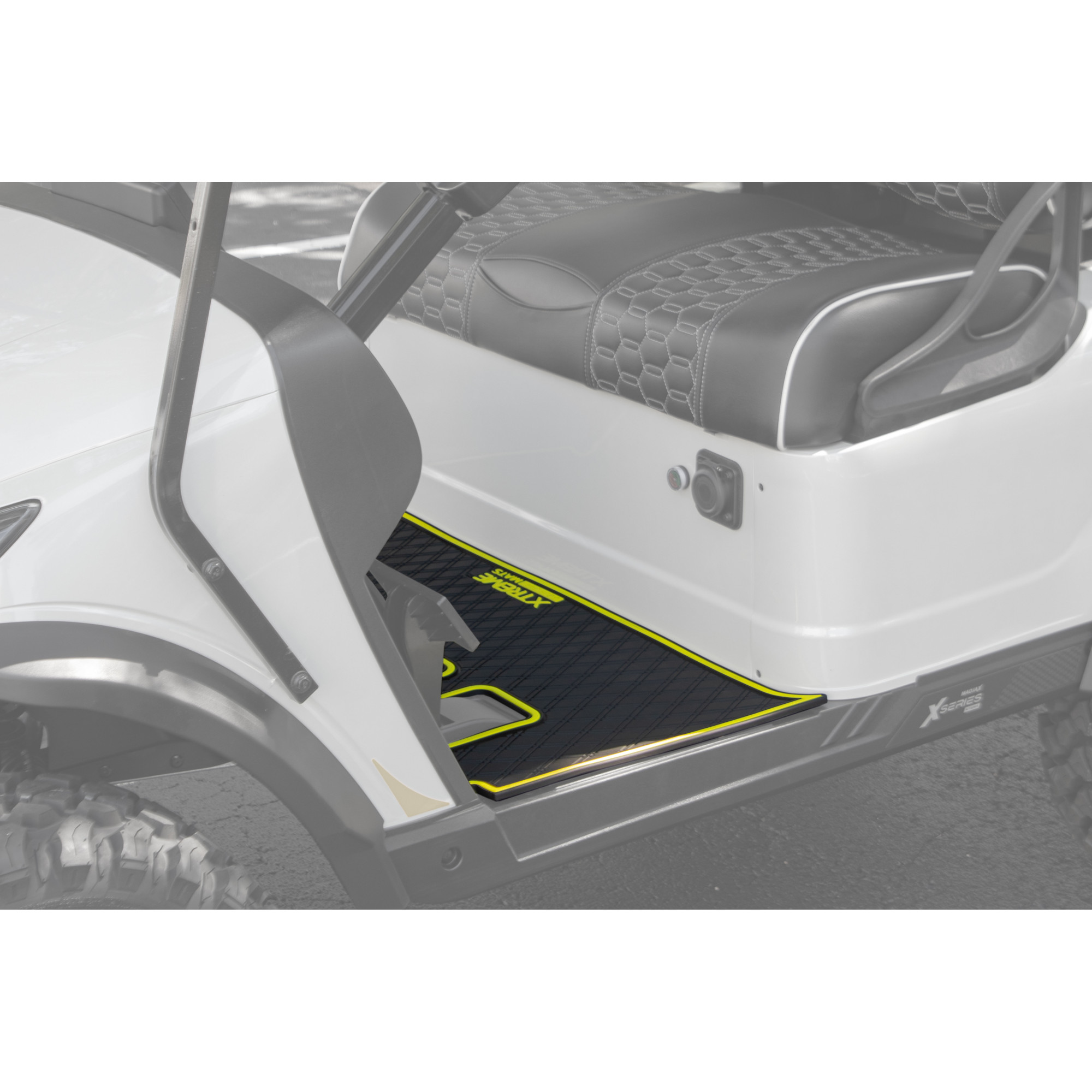 Electrify your neighborhood cruises with the Xtreme Golf Cart Floor Mat, featuring a sleek black finish with eye-catching neon yellow trim. This laser-measured mat not only shields your MadJax's floors from everyday wear and tear but also injects a bold, energetic style that's sure to spark conversations.