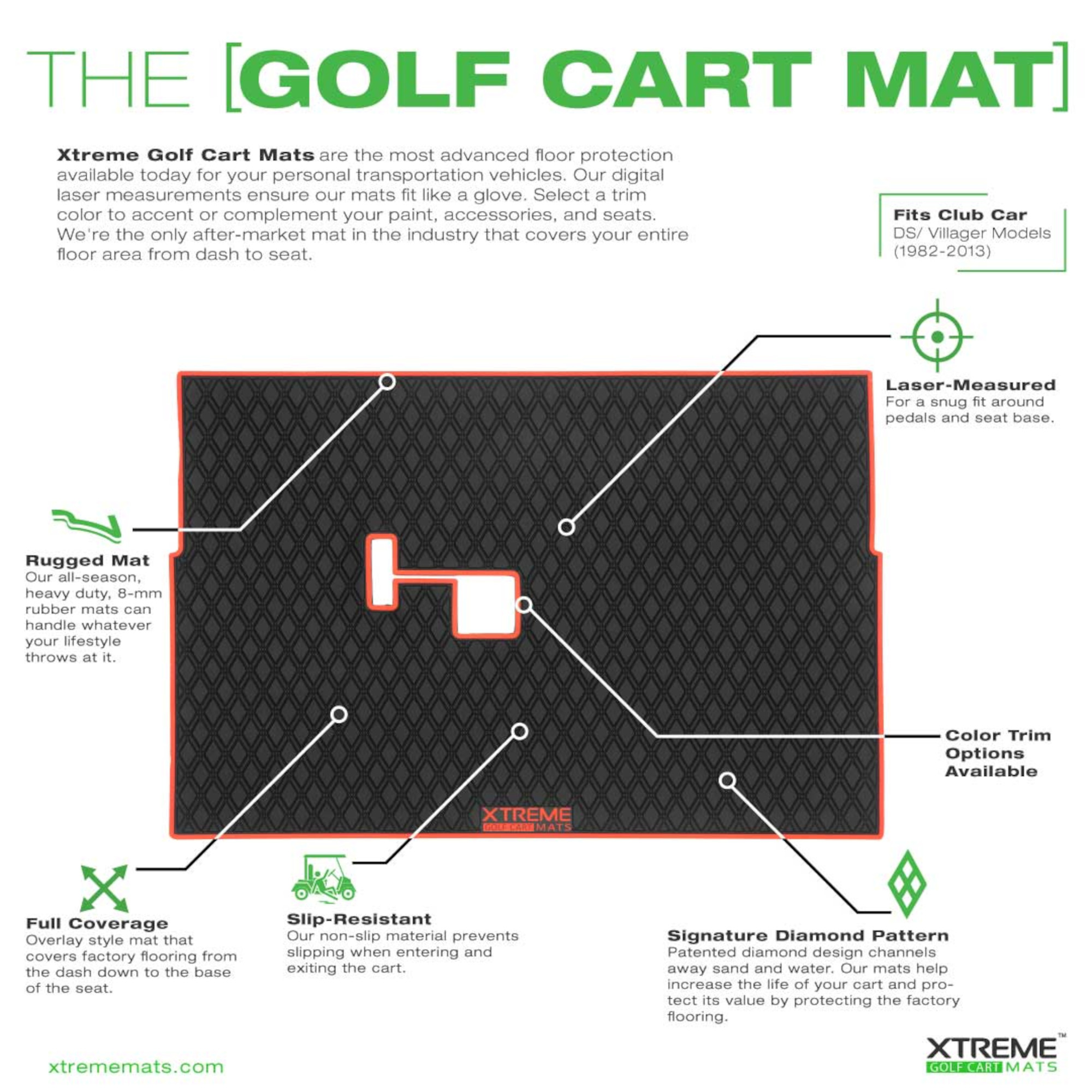Xtreme Mats has created a full coverage golf car floor mat that is laser-measured to fit as if it came directly from the manufacturer. This heavy-duty, 8-mm rubber golf cart floor mat remains securely in place even during rugged terrain navigation. The mats produce no VOCs so you won't have to worry about it stinking up your garage either! Their patented design picks up where the other guys left off. Unlike other golf cart floor mats that offer only partial coverage, Xtreme Mats won't limit where riders can place their feet and you won't end up with a pile of dirt behind your floor mat. Xtreme Mats Golf Cart Floor Mat covers your entire OEM flooring from the bottom of the dash down to the base of the seat. No longer worry about mud, water, or dirt damaging your cart's flooring! Xtreme Golf Cart Mats are available in a variety of colors to complement almost any aesthetic.