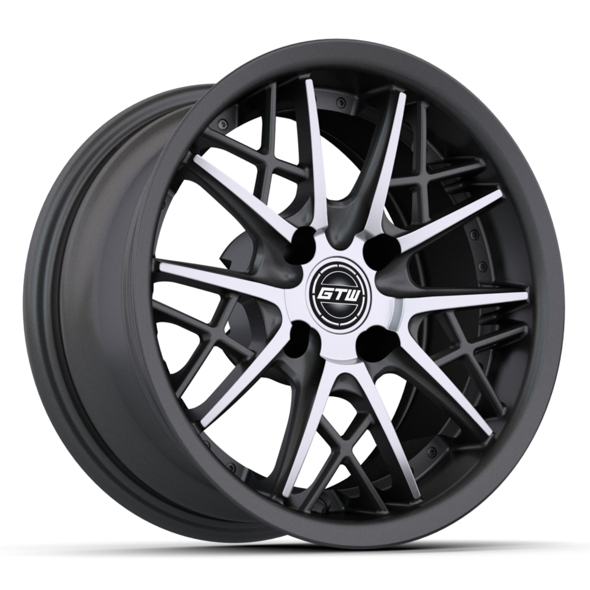 GTW 14x7 Axis Street Wheel. Available in our industry leading Matte Gray/Machined finish and is constructed of solid cast aluminum for maximum strength & minimal weight. The Axis wheel has an exclusive GTW Multi-Spoke design, dual finish spokes, recessed rim lip, and two-piece look. The Axis pairs great with our premium line of tires and accessories