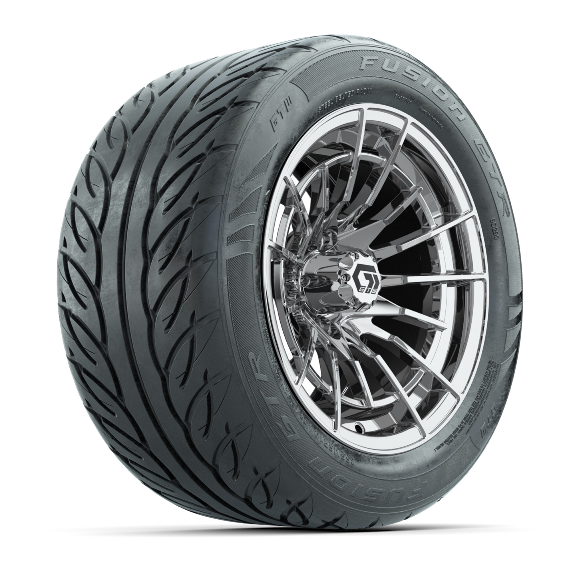 A set of (4) 14-inch GTW® Boost Chrome golf cart wheels mounted on 255/45-R14 Fusion GTR Steel Belt Radial Street Tires