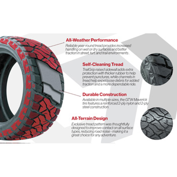 - (4) 23x10.00-R12 GTW Maverick All-Terrain Tires / Tire is approx. 23” tall (4-Ply)