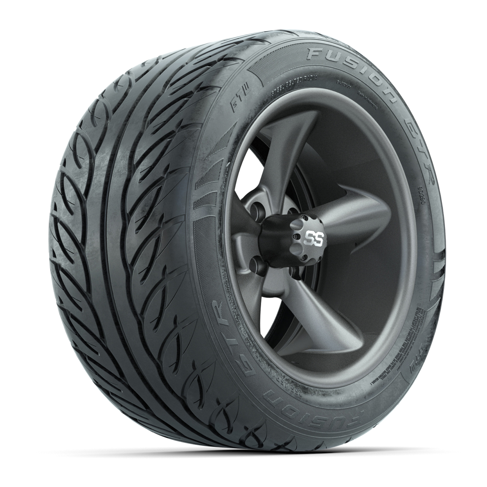 A set of (4) 14-inch GTW® Godfather Matte Gray golf cart wheels mounted on 255/45-R14 Fusion GTR Steel Belt Radial Street Tires