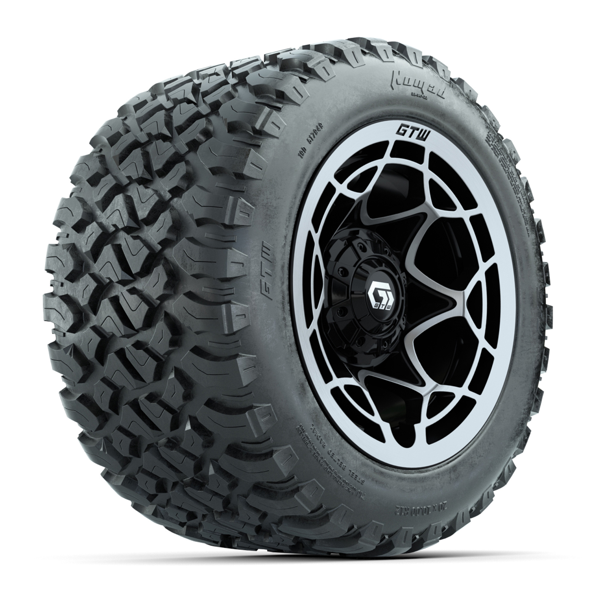 A set of (4) 12-inch GTW® Nexus Black with Silver Face golf cart wheels mounted on 20X10-12 GTW® Nomad Steel Belt Radial All-Terrain Tires