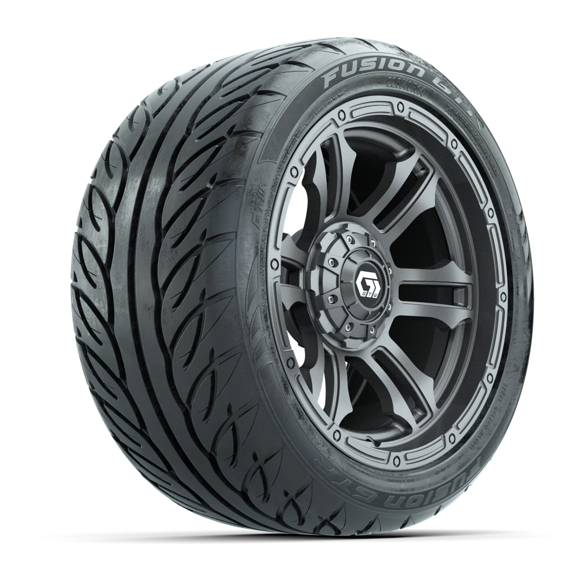 A set of (4) 14-inch GTW® Shogun Gunmetal golf cart wheels mounted on 225/40-R14 Fusion GTR Steel Belt Radial Street Tires