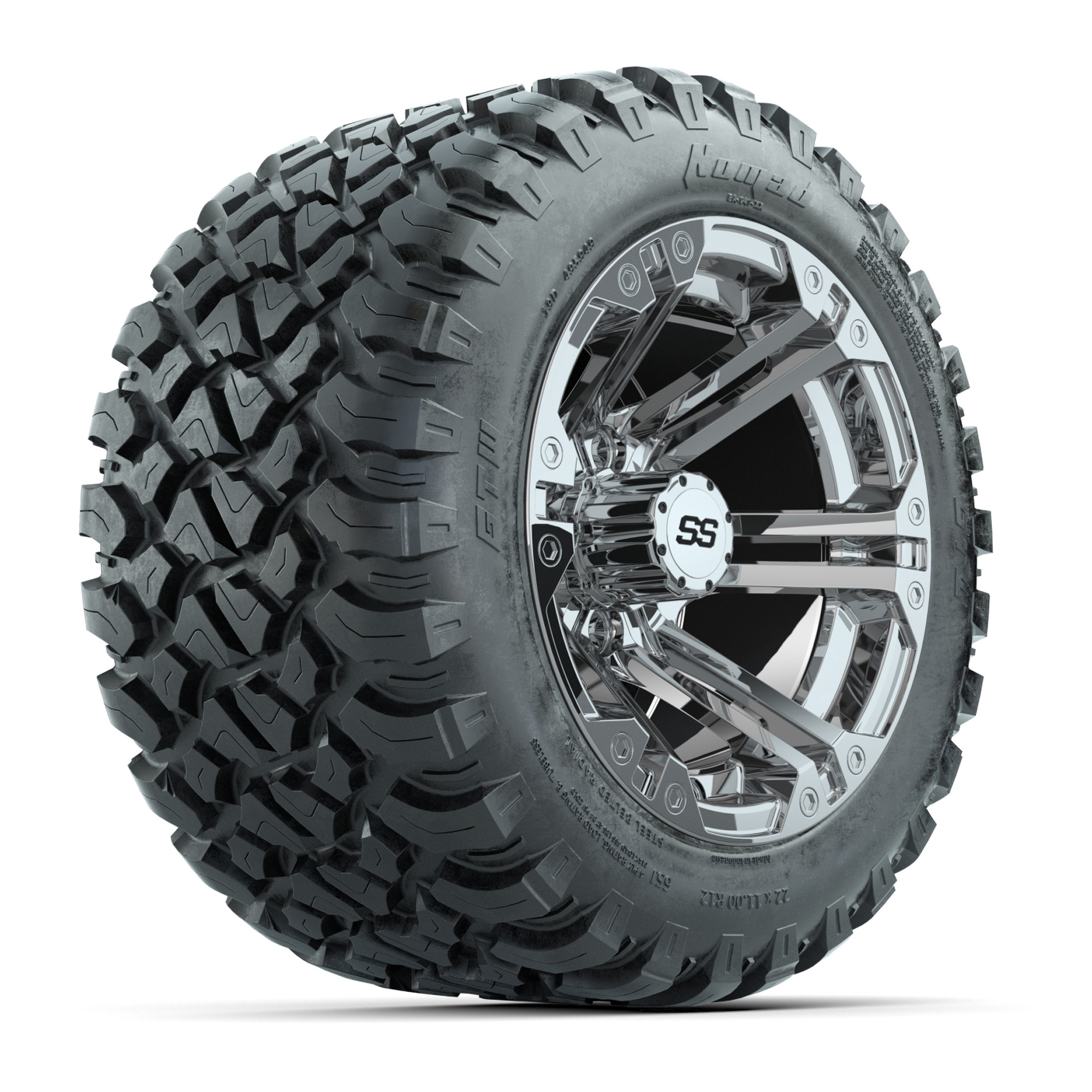 A set of (4) 12-inch GTW® Specter Chrome golf cart wheels mounted on 22X11-R12 GTW® Nomad Steel Belt Radial All-Terrain Tires
