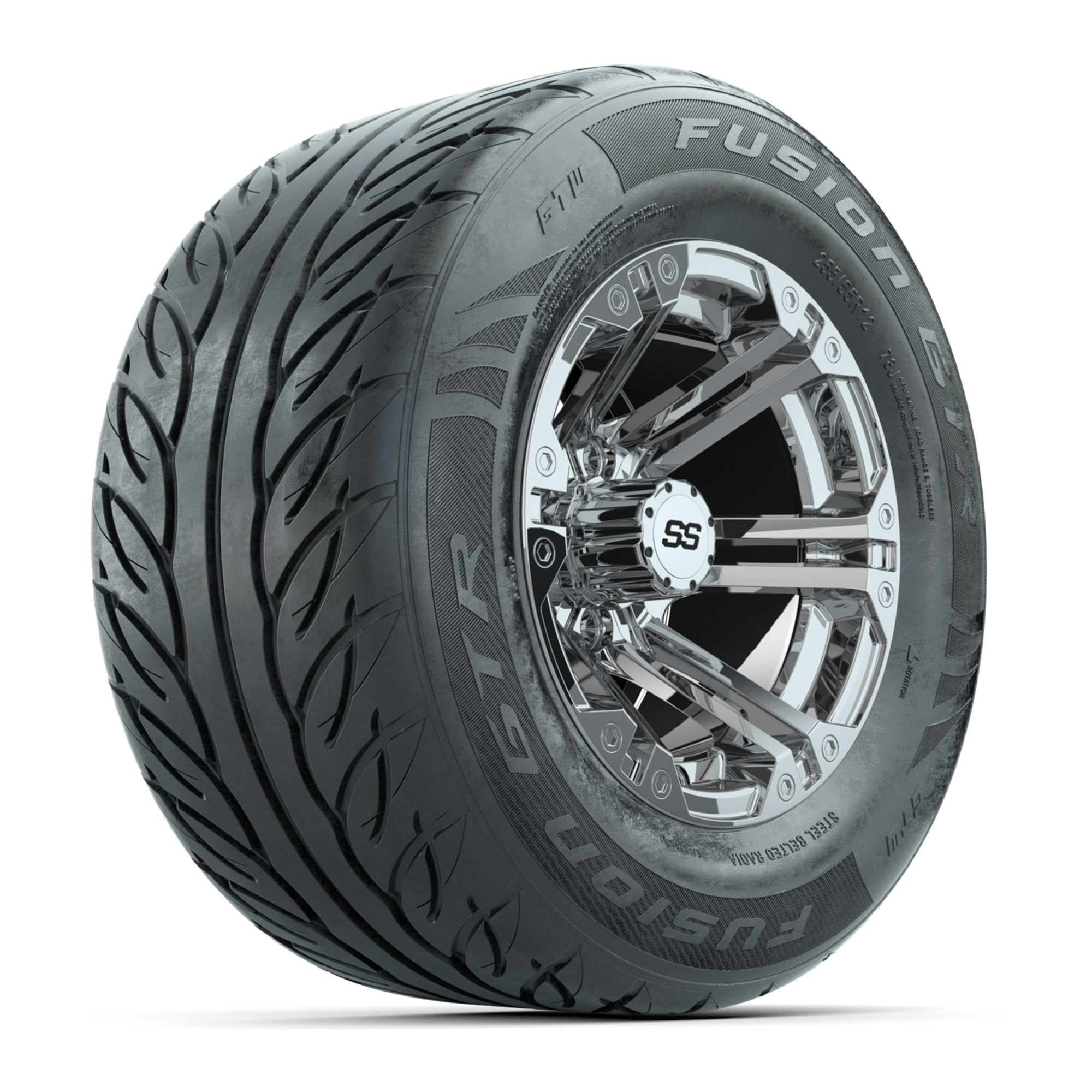 A set of (4) 12-inch GTW® Specter Chrome golf cart wheels mounted on 255/55-R12 Fusion GTR Steel Belted Street Tires