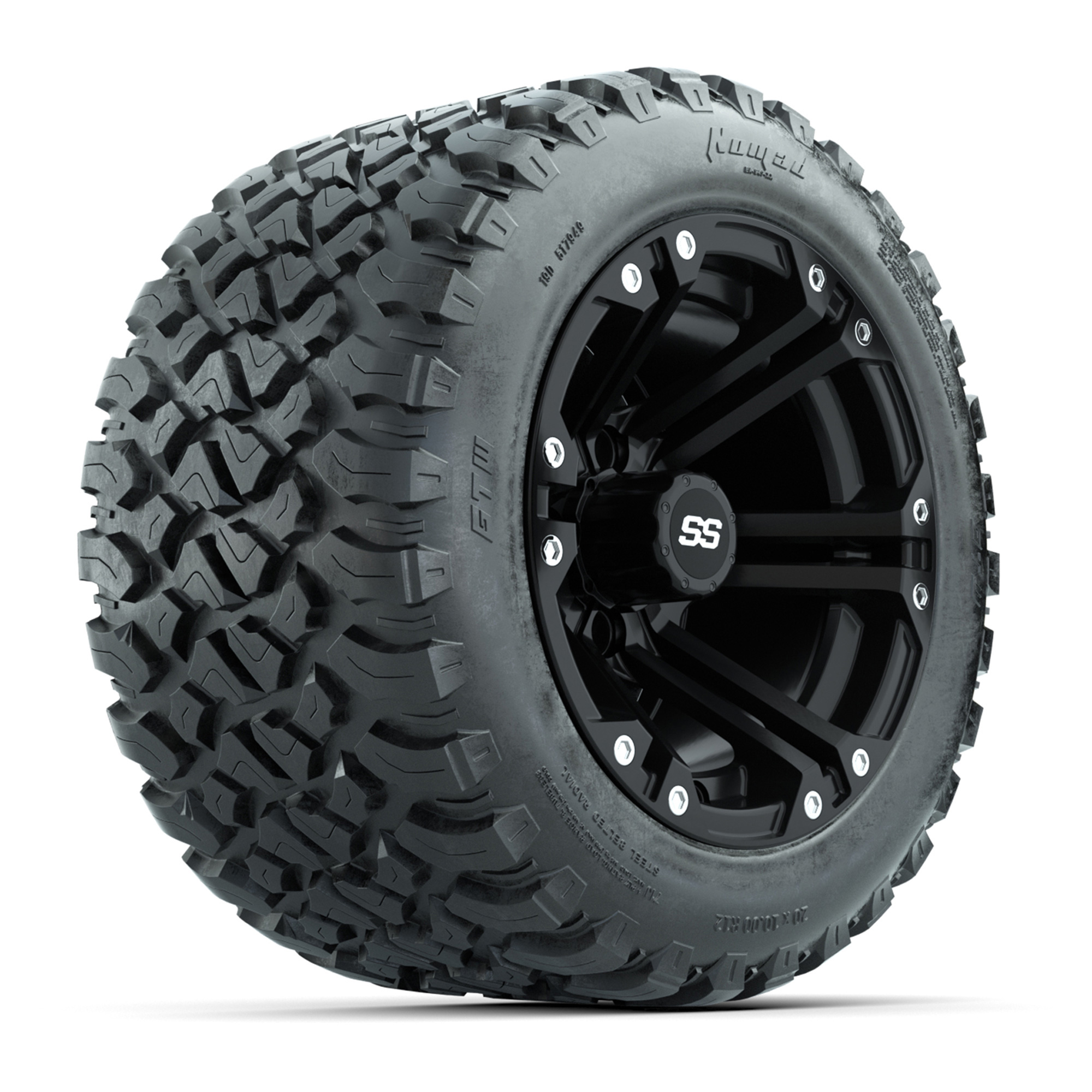 A set of (4) 12-inch GTW® Specter Matte Black golf cart wheels mounted on 20X10-12 GTW® Nomad Steel Belt Radial All-Terrain Tires