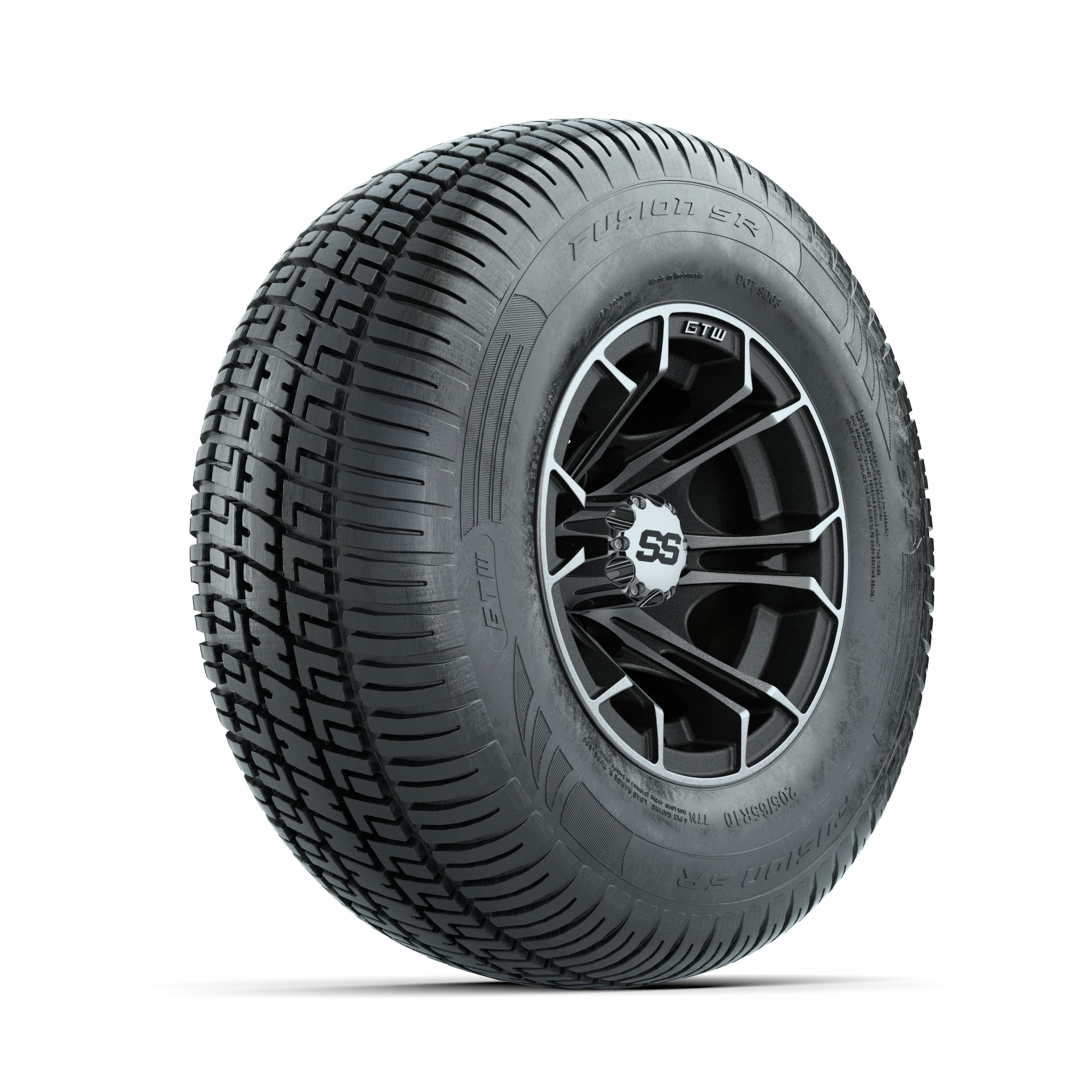 A set of (4) 10-inch GTW® Spyder Machined/Matte Grey golf cart wheels Mounted on 205/65-R10 Fusion SR Steel Belted Radial Tires