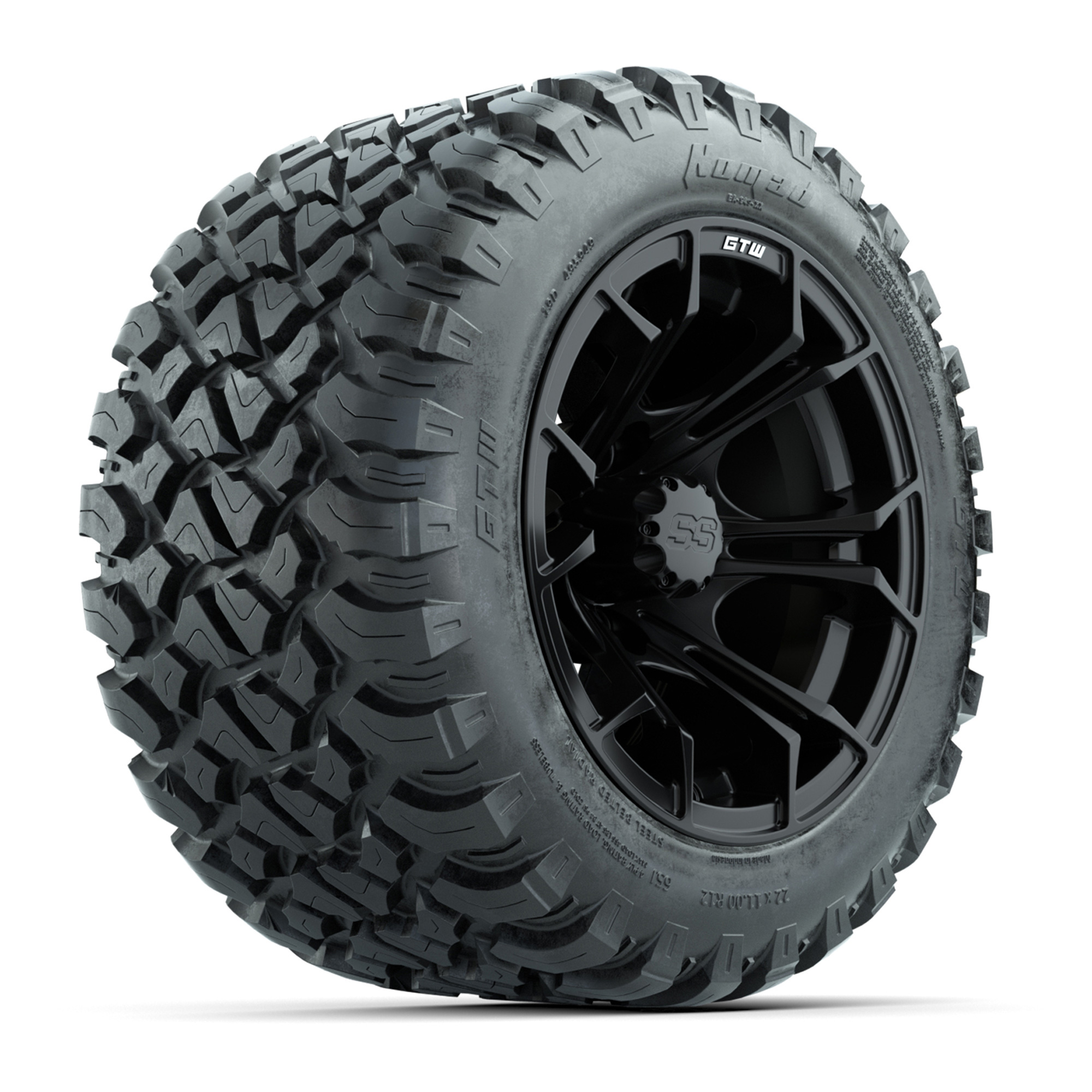 A set of (4) 12-inch GTW® Spyder Matte Black golf cart wheels mounted on 22X11-R12 GTW® Nomad Steel Belt Radial All-Terrain Tires