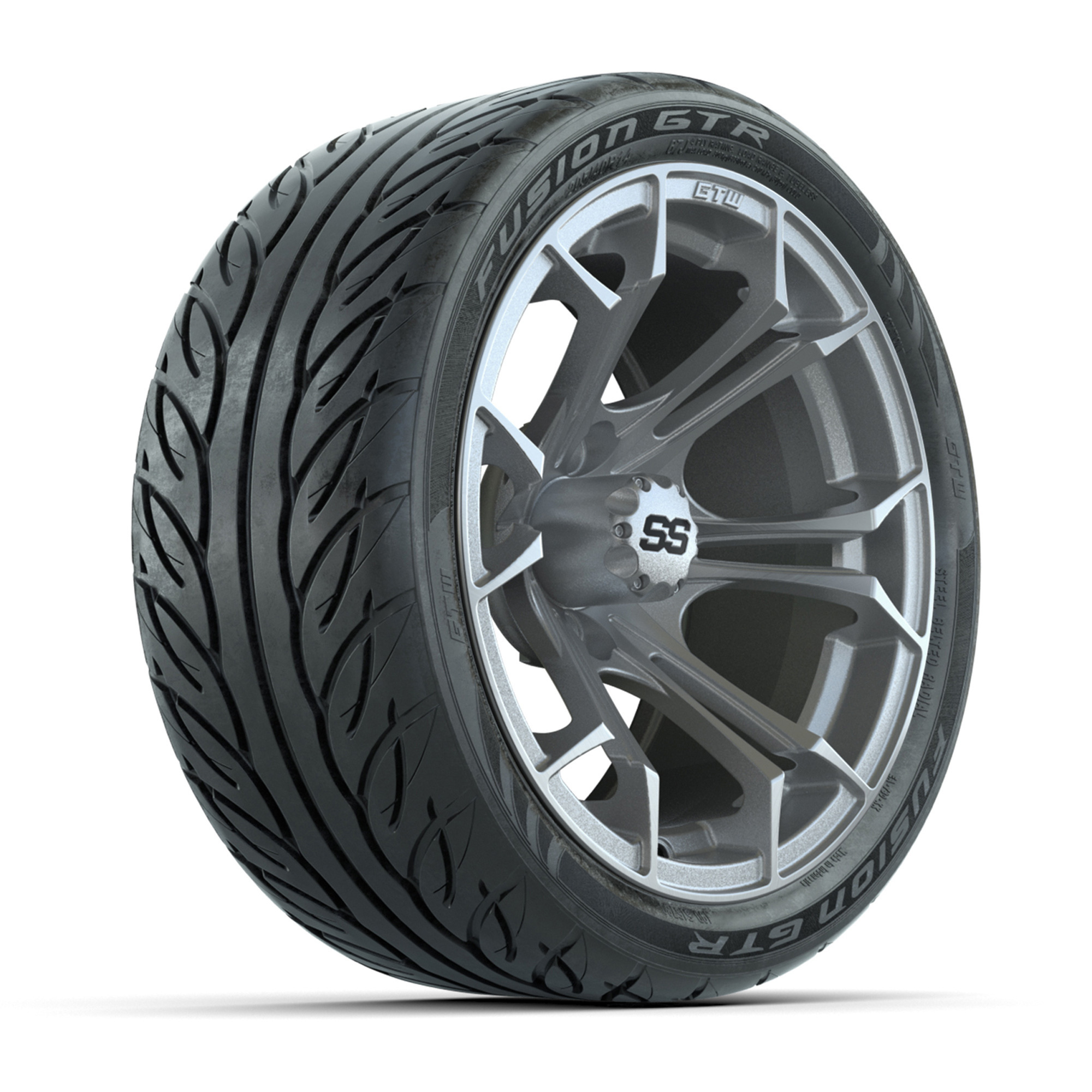 A set of (4) 14-inch GTW® Spyder Silver Brush golf cart wheels mounted on 205/40-R14 Fusion GTR Steel Belt Radial Street Tires