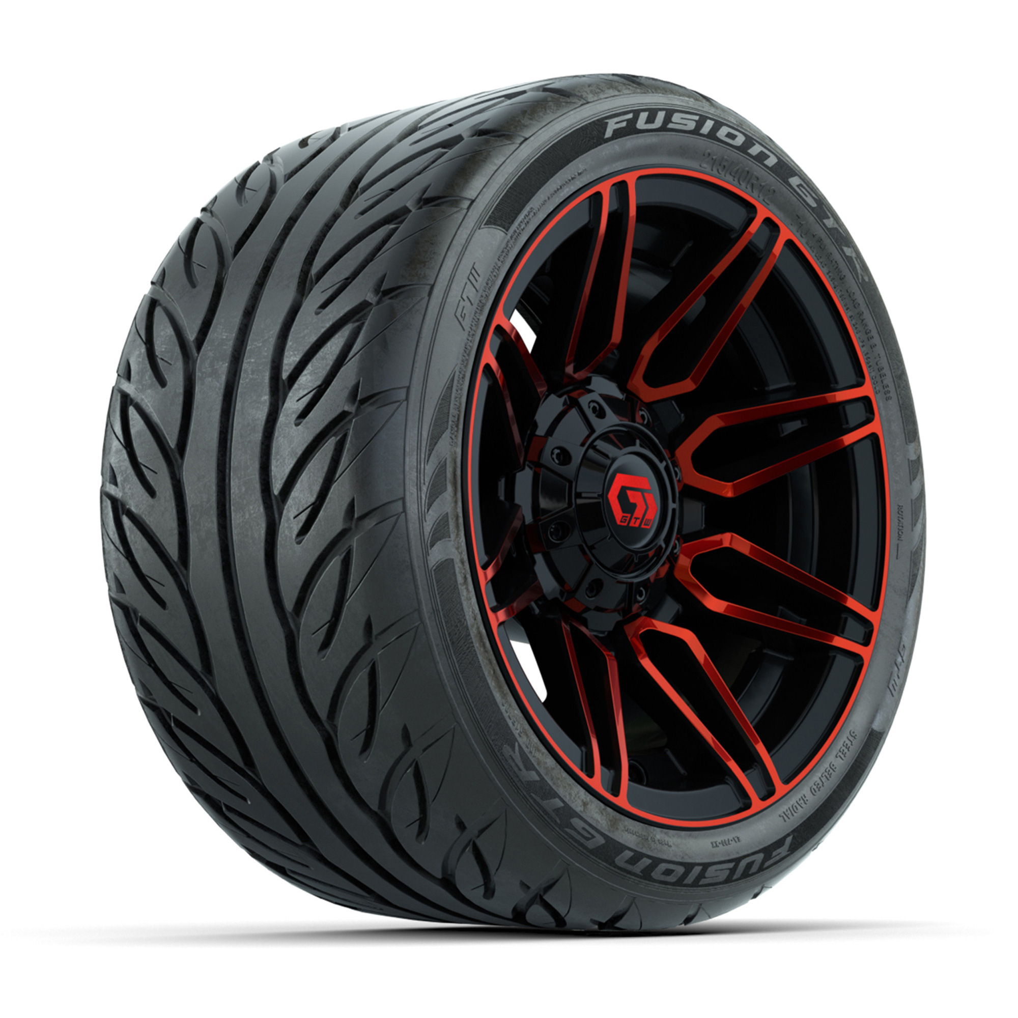 A set of (4) 12-inch GTW® Stealth Red/Machined golf cart wheels mounted on 215/40-R12 Fusion GTR Steel Belt Radial Street Tires