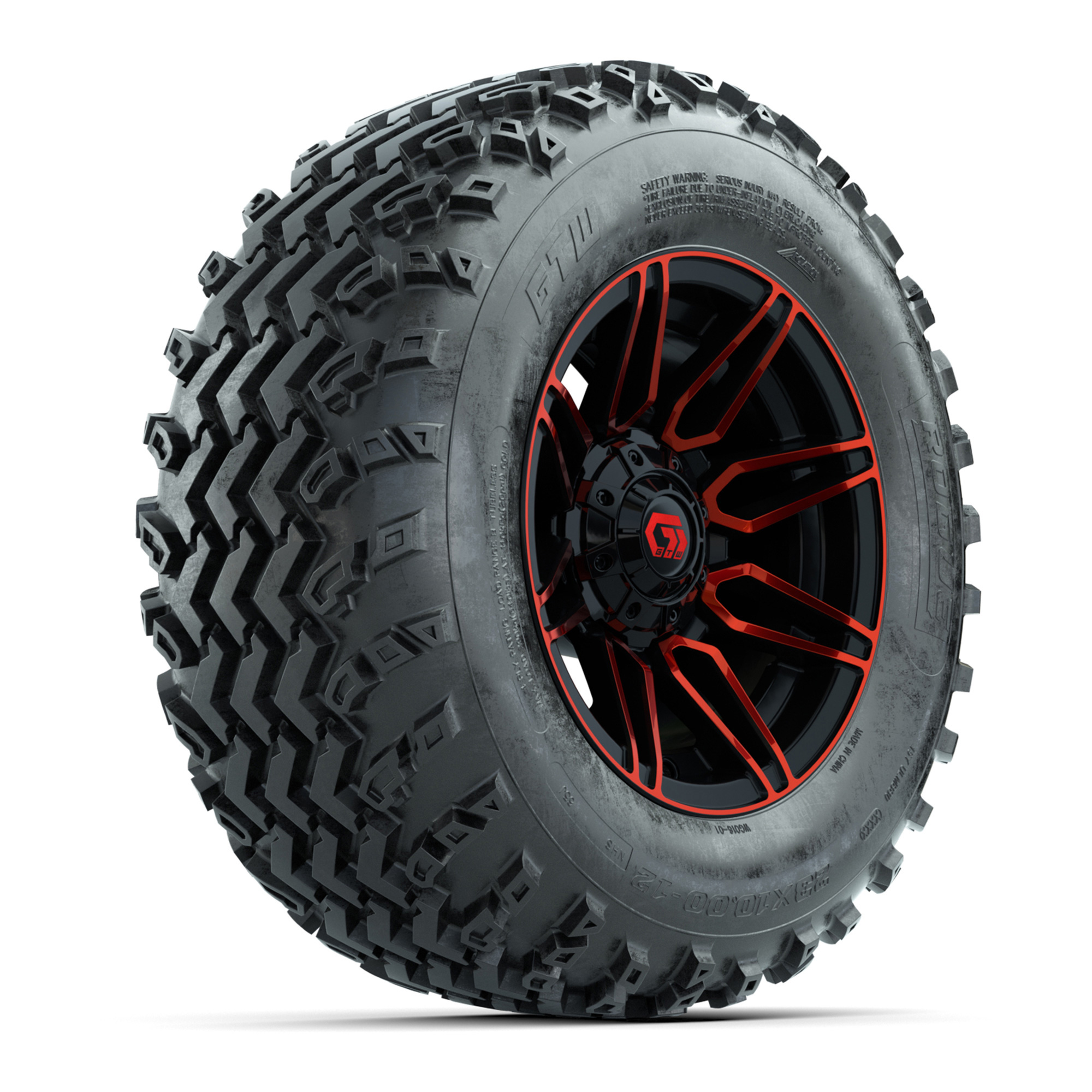 A set of (4) 12-inch GTW® Stealth Red/Machined golf cart wheels mounted on 23x10-12 GTW® Rogue all-terrain tires