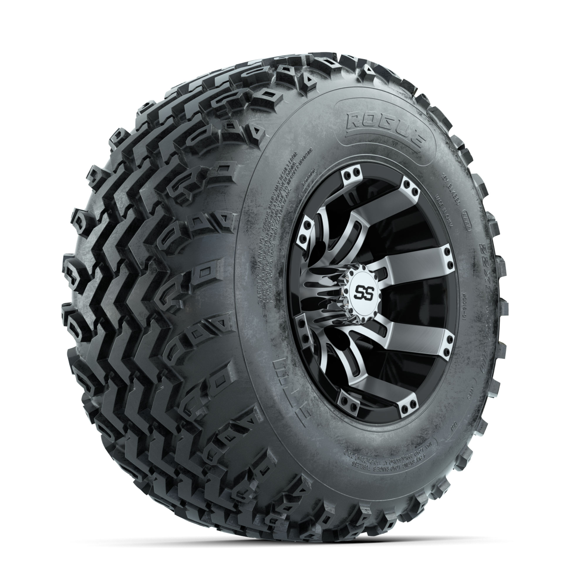 A set of (4) 10-inch GTW® Tempest Machined/Black golf cart wheels Mounted on 22x11.00-10 Rogue All-Terrain Tires