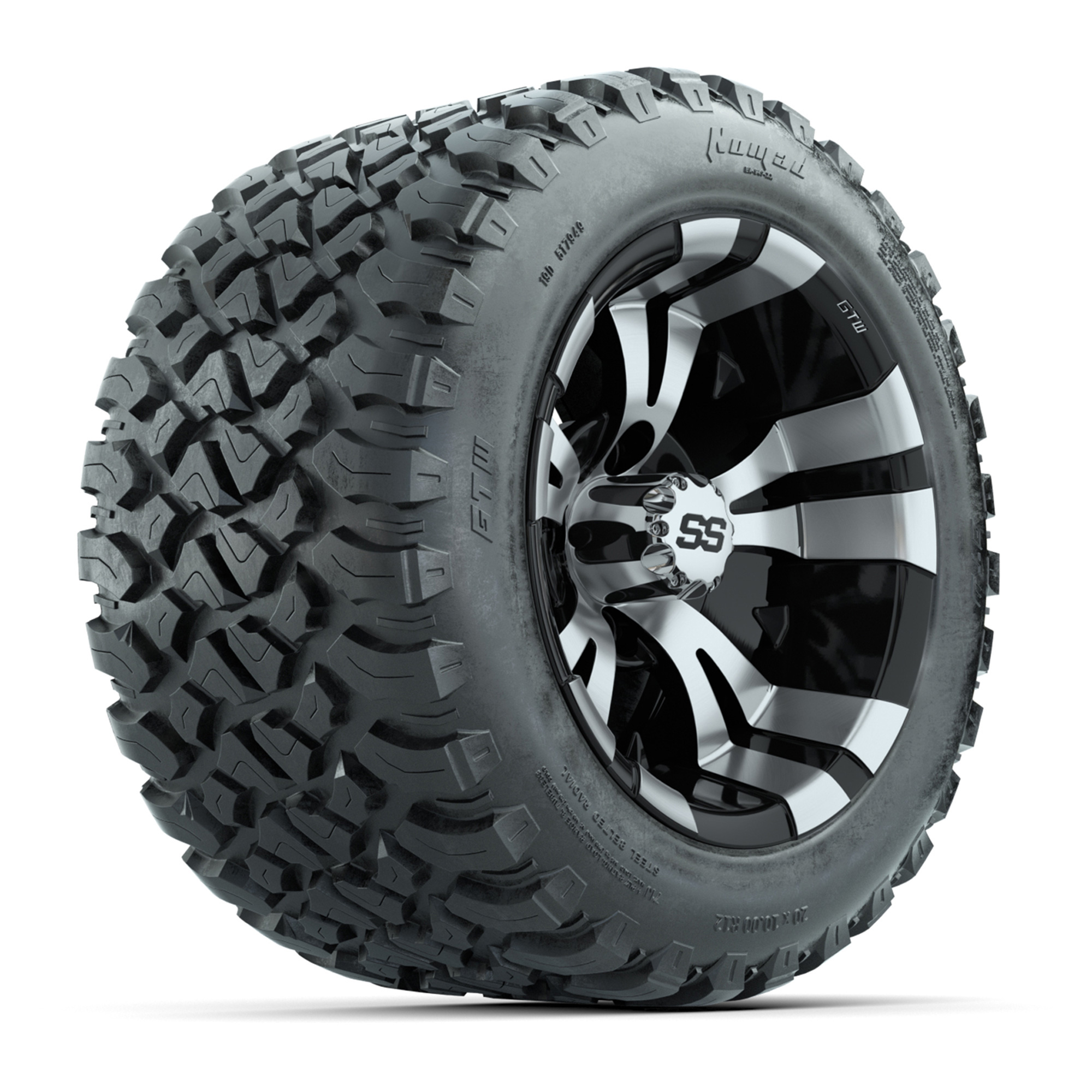 A set of (4) 12-inch GTW® Vampire Black/Machined golf cart wheels mounted on 20X10-12 GTW® Nomad Steel Belt Radial All-Terrain Tires