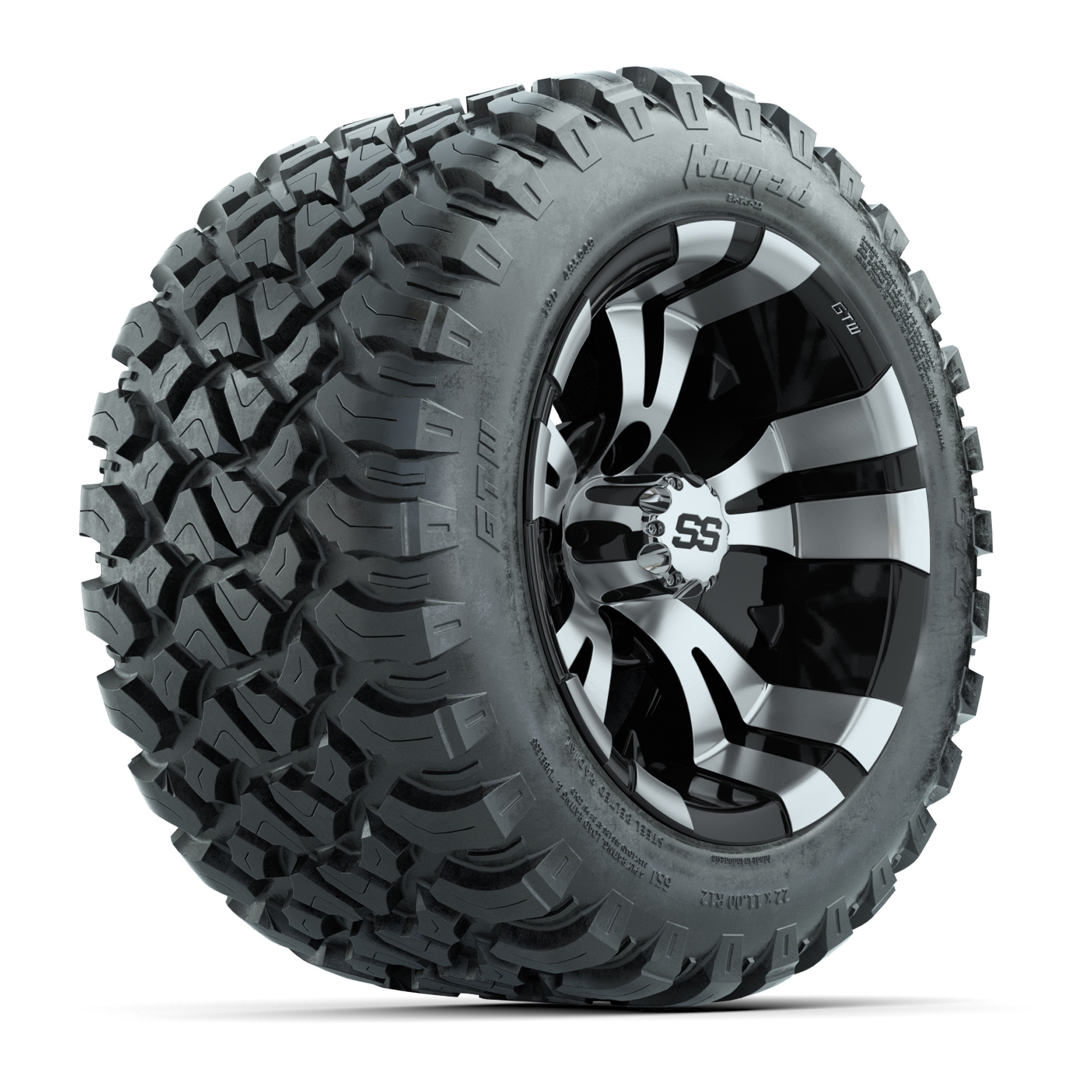 A set of (4) 12-inch GTW® Vampire Black/Machined golf cart wheels mounted on 22X11-R12 GTW® Nomad Steel Belt Radial All-Terrain Tires