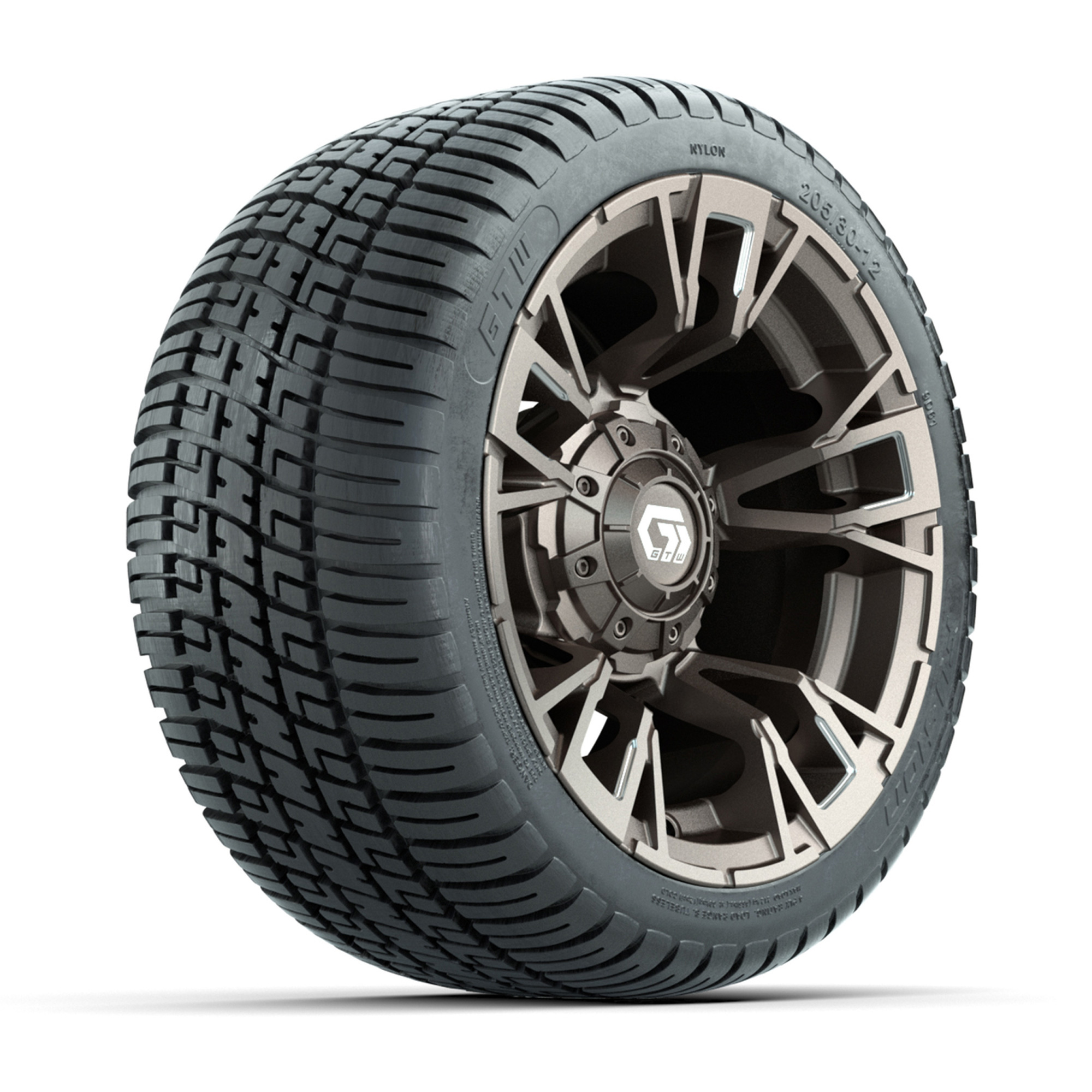 A set of (4) 12-inch GTW® Vandal Bronze/Machined golf cart wheels mounted on 205/30-12 Fusion Street Tires