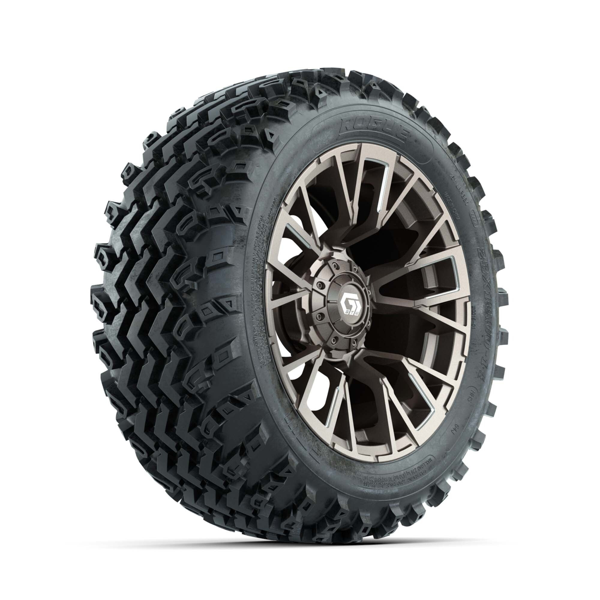 A set of (4) 14-inch GTW® Vandal Bronze/Machined golf cart wheels mounted on 23x10-14 GTW® Rogue all-terrain tires