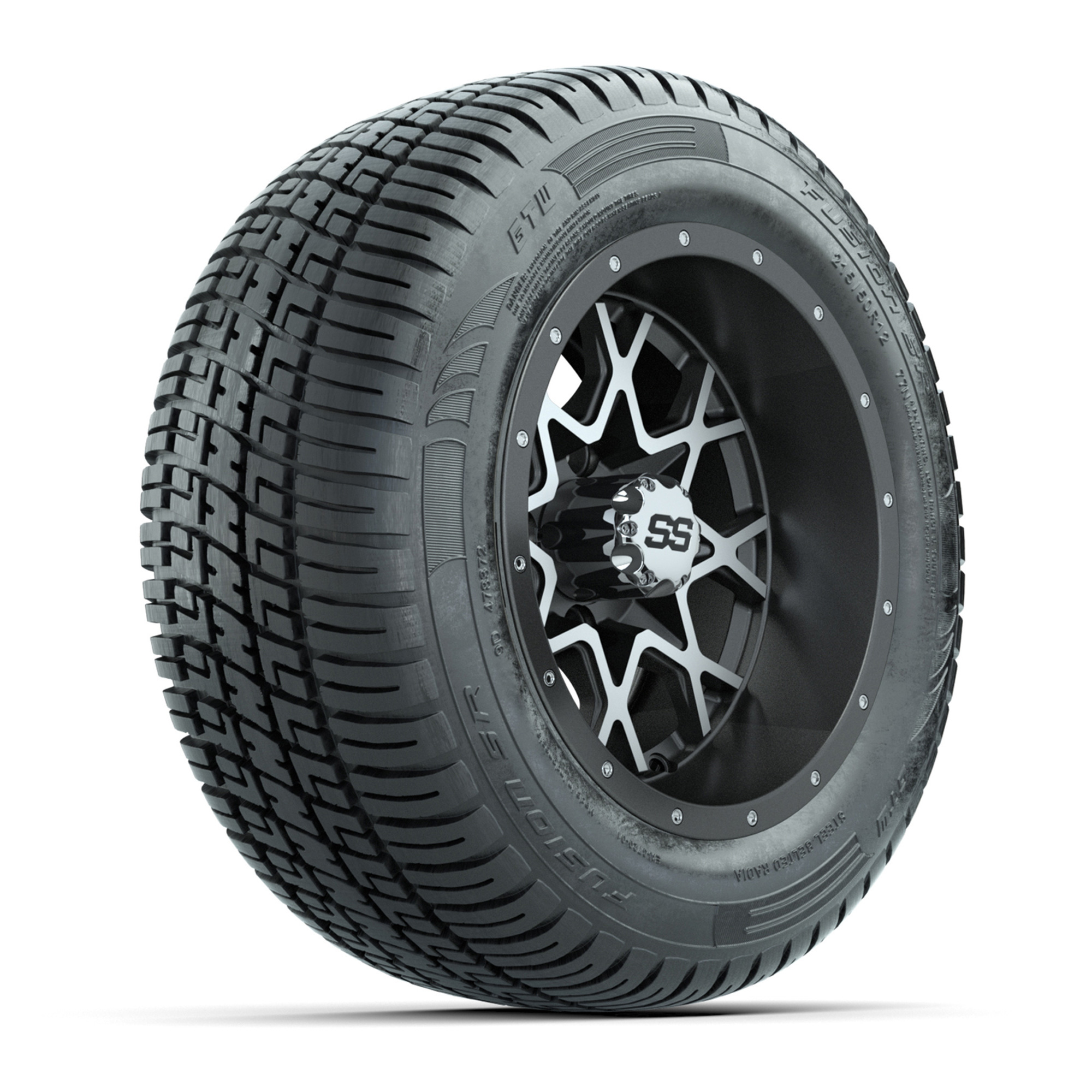 A set of (4) 12-inch GTW® Vortex 2 Matte Gray/Machined golf cart wheels mounted on 215/50-R12 Fusion S/R Steel Belt Radial Street Tires